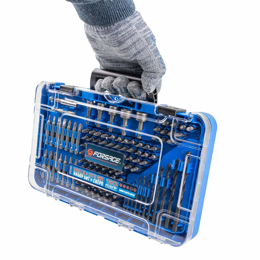 Набор бит PH, SL, SQ, Torx, Hex, головок 7-13 мм, сверл по металлу 1,5-8 мм 120 пр. Forsage F-10120