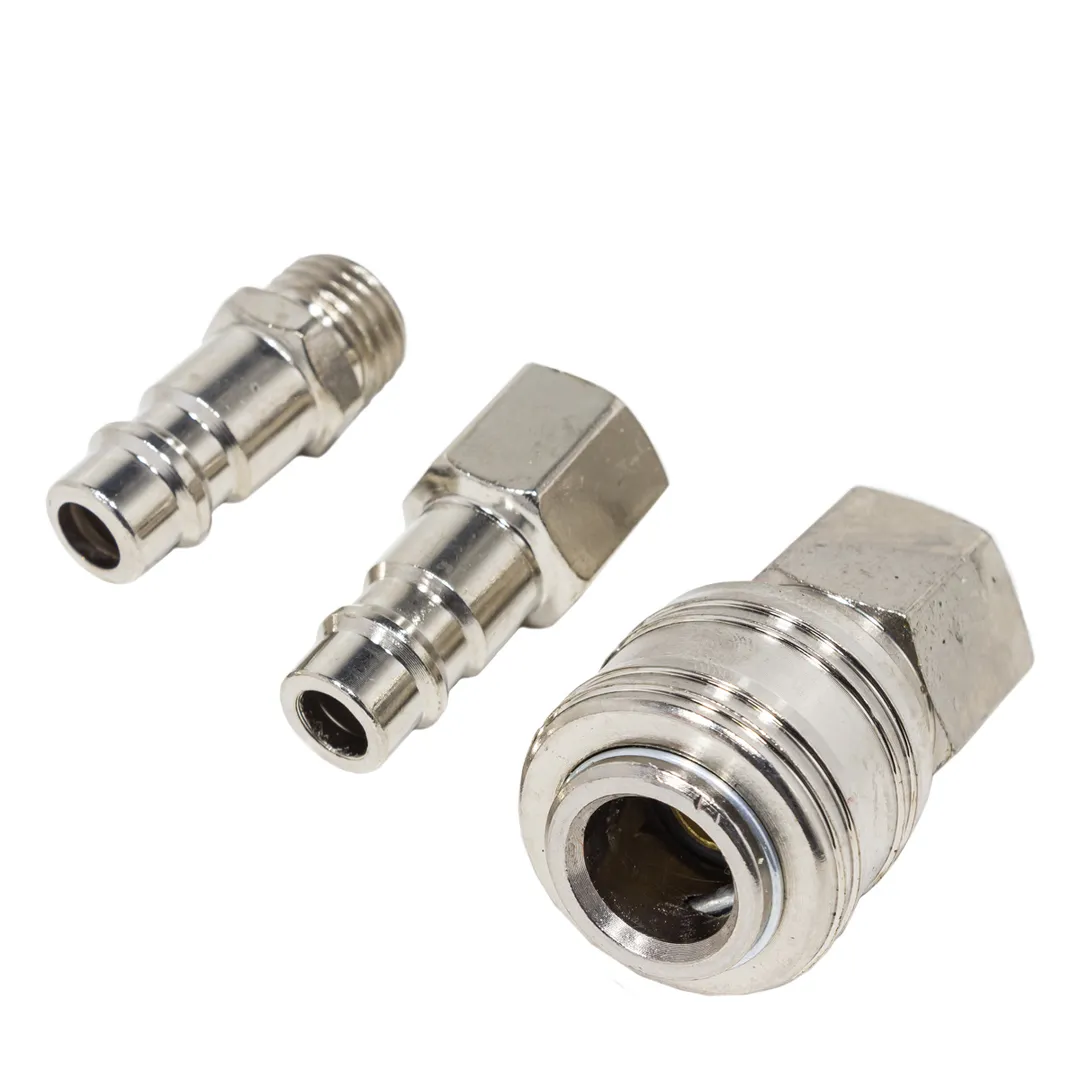 Набор быстроразъёмных соединений для соединения труб, шлангов, оборудования и инструмента. Позволяет очень быстро соединить части оборудования, такое соединение характеризуется высоким уровнем герметичности, а также простотой и удобством. Монтаж данного вида соединений не нуждается в применении инструментов. Быстросъемное соединение состоит из двух деталей: штуцера и муфты (так называемых " папы" и " мамы" ). Набор быстросъёмных соединений изготовлен из инструментальной стали, отличается износостойкостью, прочностью и герметичностью. Использование данного набора быстроразъемных соединений позволяет быстро присоединять и отсоединять пневматический шланг к любому пневматическому инструменту, снабженному резьбовым соединением 1/4" (наружная), например, краскопультам. Набор предметов включает: Быстроразъем с внутренней резьбой 1/4" Штуцер для быстроразъема с внутренней резьбой 1/4" Штуцер для быстроразъема с наружной резьбой 1/4" .Преимущества работы с нами