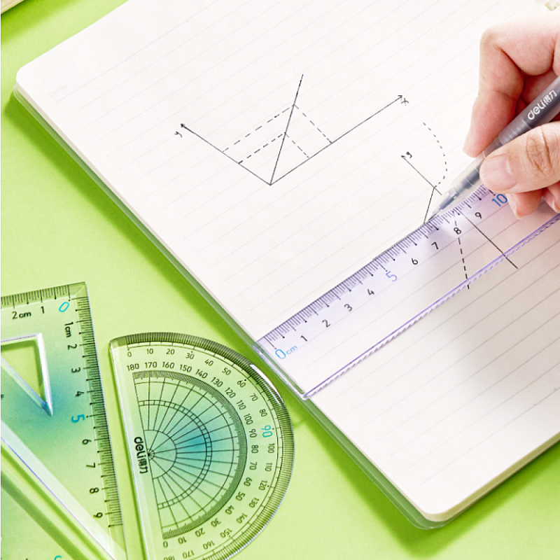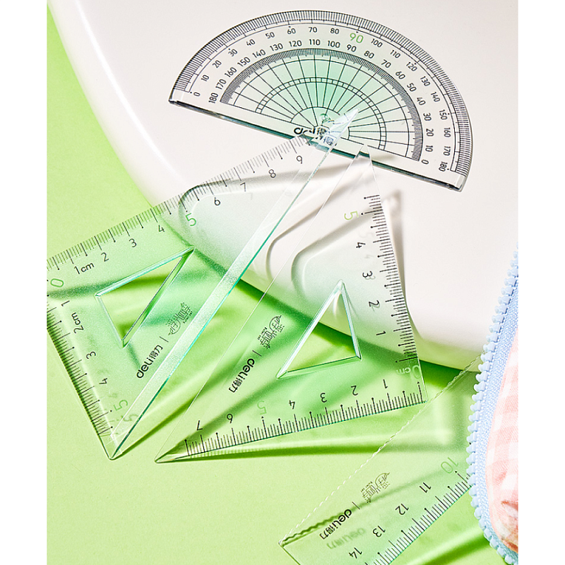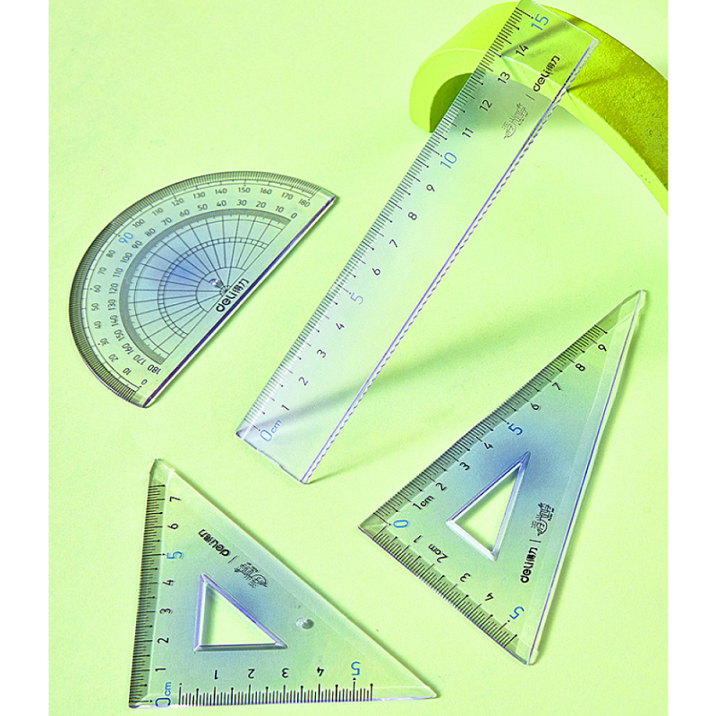 Набор чертежный "Deli VC158": линейка 15 см, треугольник 45 и 60 гр, транспортир 180 гр, ассорти