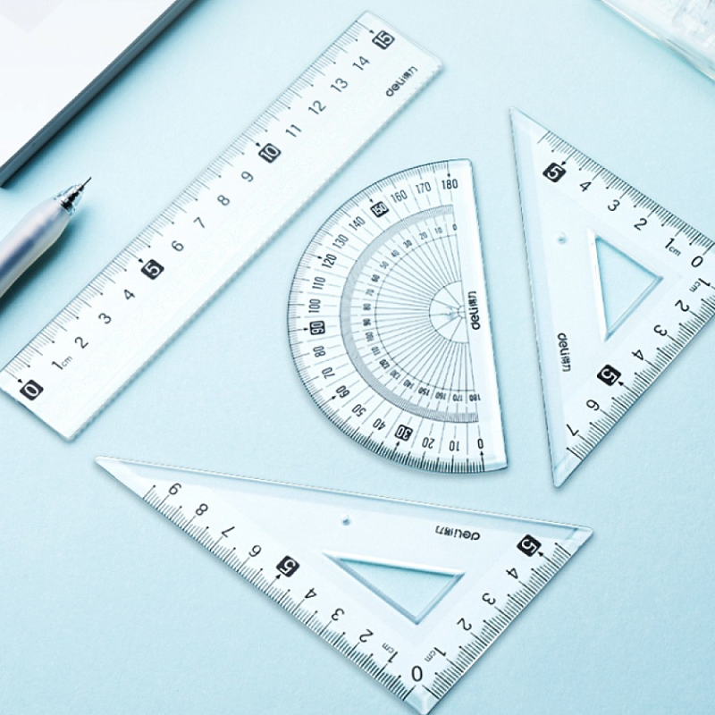 Набор чертежный "Deli VC23": линейка 15 см, треугольник 45 и 60 гр, транспортир 180 гр, прозрачный