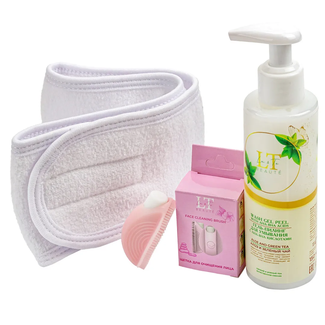 Набор для очищения кожи лица, щетка для лица электромеханическая, гель-пилинг для умывания, повязка белая на липучке, пакет 20*25 La and Te beaute LT-54