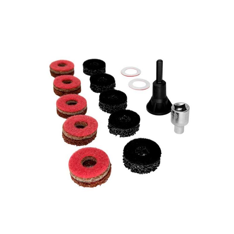 Предназначен для очистки грязи, ржавчины и других загрязнений колесных шпилек и болтов. Конструкция крепления на липучке для быстрой замены зачистных дисков.