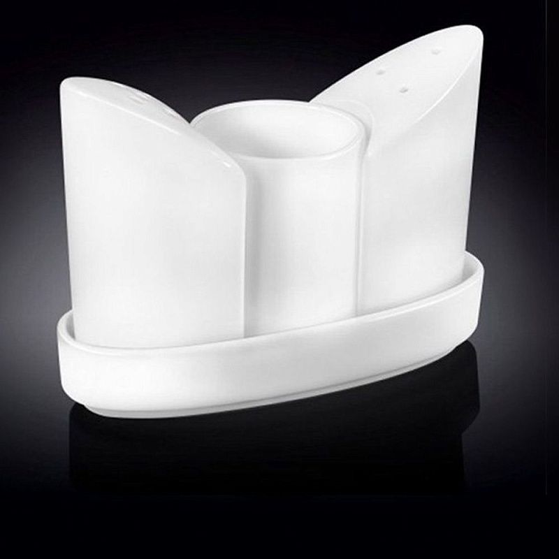 Набор для специй Wilmax состоит из четырех предметов: солонки, перечницы, держателя для зубочисток и овального блюдца-подставки. Набор Wilmax – элегантная классика сервировки стола. Лаконичный дизайн, универсальная форма, традиционный белый цвет, гладкость и блеск текстуры. Такой набор станет хорошим украшением вашего праздничного стола.