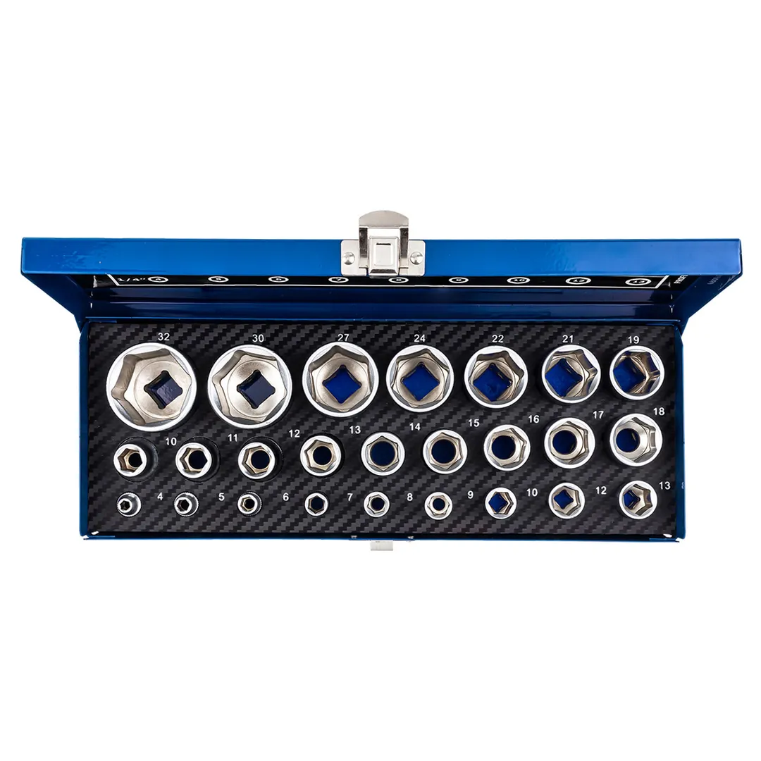 Набор из 25 торцевых 6-гранных головок 1/2"и 1/4"- головки для слесарно-монтажного инструмента, предназначенные для работы с резьбовым крепежом узлов и механизмов тяжелой техники. Используются с трещоточными ключами или в качестве оснастки для гайковерта (электрического, пневматического). Изготовлены из хром ванадиевой стали (CR-V), способны выдерживать интенсивное использование и сохранять свои качества на протяжении длительного времени. Головка имеет 6-гранный профиль, который обеспечивает прочное сцепление с болтами и гайками. Это позволяет снизить вероятность скольжения и повреждения головки, а также повысить эффективность работы. Посадочный квадрат 1/2"и 1/4", что обеспечивает их совместимость с различными ручными и пневматическими инструментами. Размеры головок 1/2": 10, 11, 12, 13, 14, 15, 16, 17, 18, 19, 21, 22, 24, 27, 30, 32 мм. Размеры головок 1/4": 4, 5, 6, 7, 8, 9, 10, 12, 13 мм. Головки хранятся в ложементе с индивидуальным посадочным местом для каждой головки. Для удобства хранения и транспортировки набор поставляется в металлическом кейсе.Преимущества работы с нами