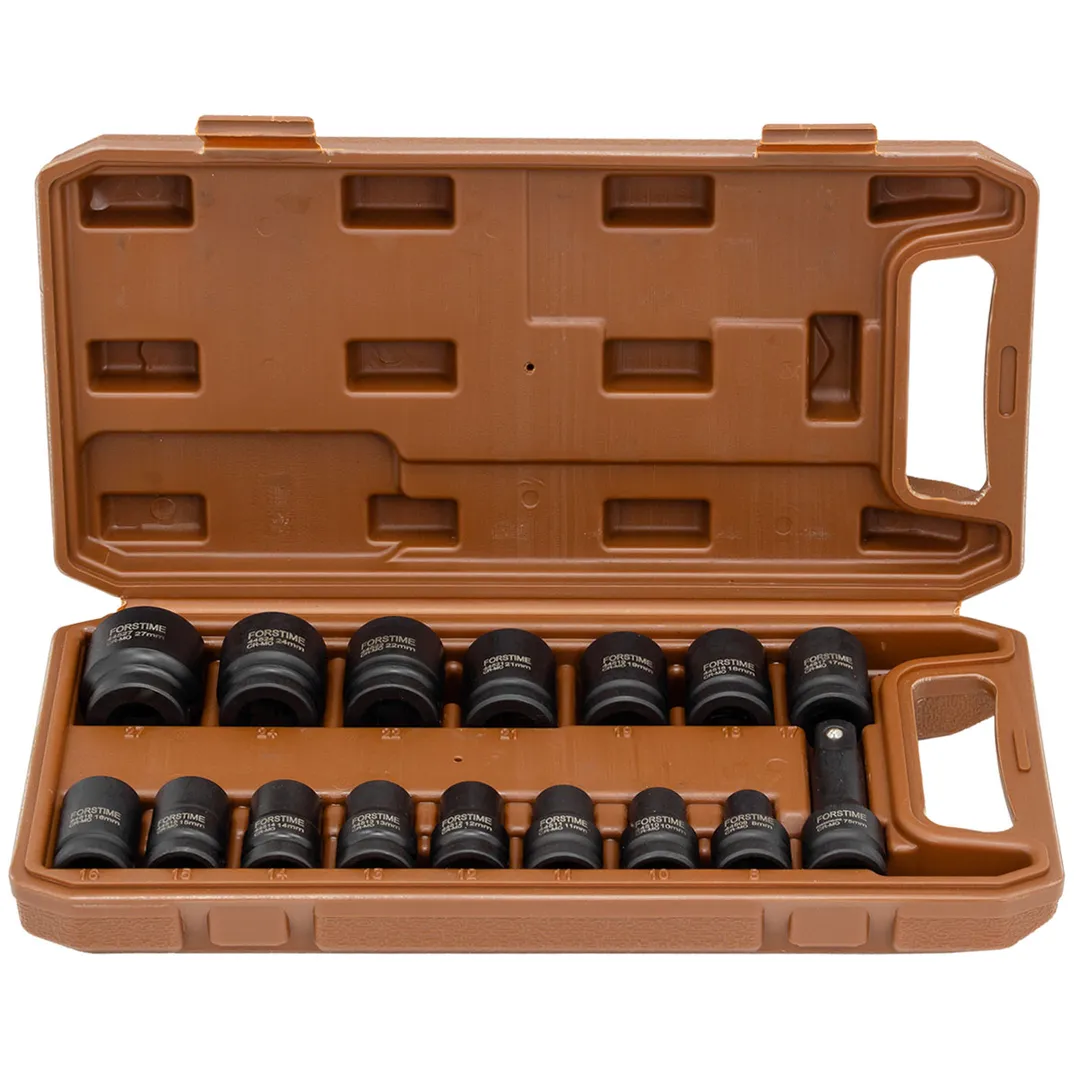 Набор ударных головок 8-27 мм 1/2'' 6- гр 16 пр, удлинитель 75 мм FORSTIME FT-4179-5MPB
