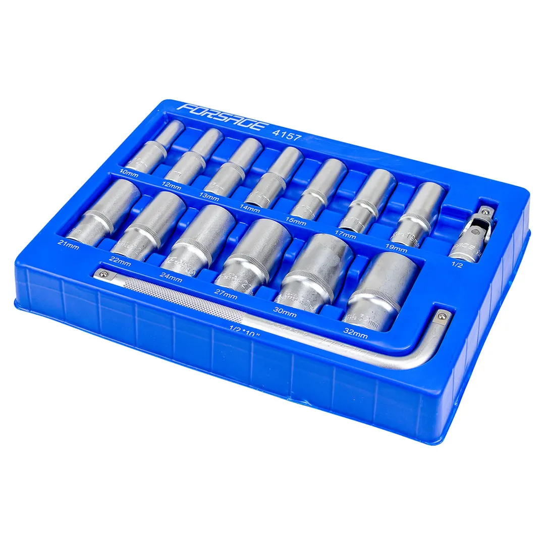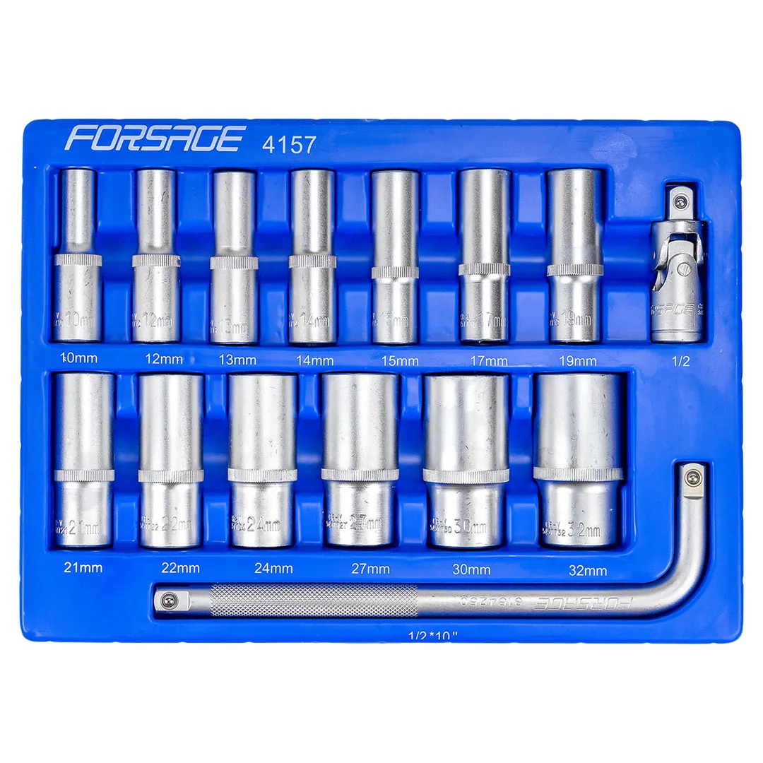 Набор головок глубоких 15 пр. 1/2" 10-32 мм 6-гр в ложементе Forsage F-4157, описание и характеристики: