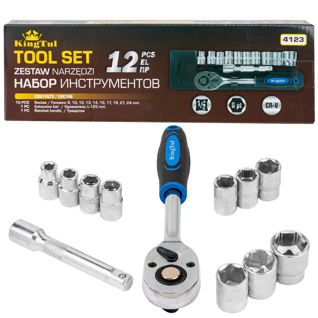 Набор головок с трещоткой и удлинителем 12 пр. 1/2'', 6-гр, 8-24 мм KINGTUL KT-4123