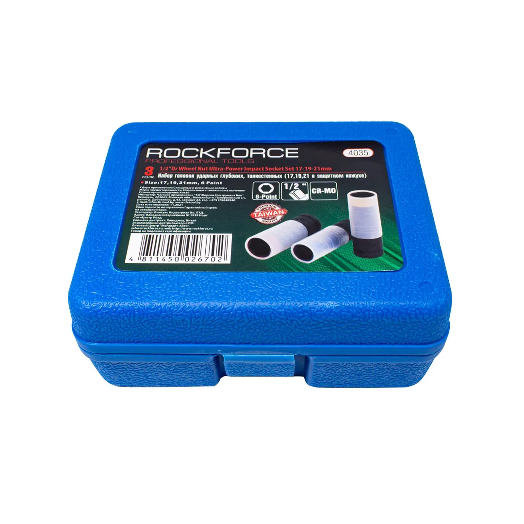 Набор головок ударные глубоких тонкостенных в защитном кожухе, 3 пр., 1/2'', 6-гр., 17,19,21 мм RockForce RF-4035, описание и характеристики: