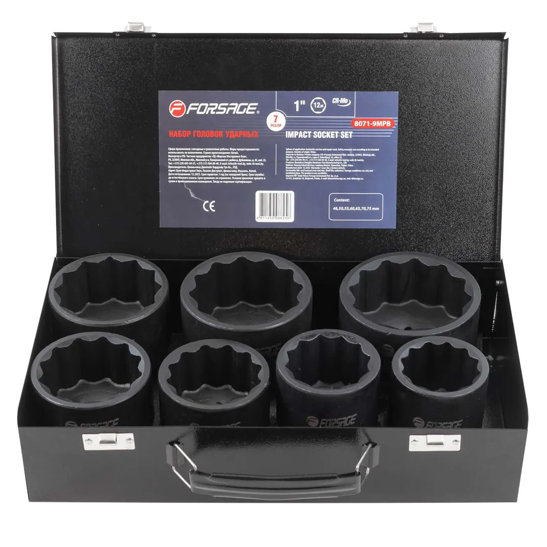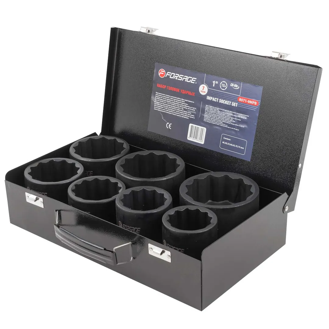 Набор головок ударных 1" 7 пр., 12-гр., 46, 50, 55, 60, 65, 70, 75 мм Forsage F-8071-9MPB