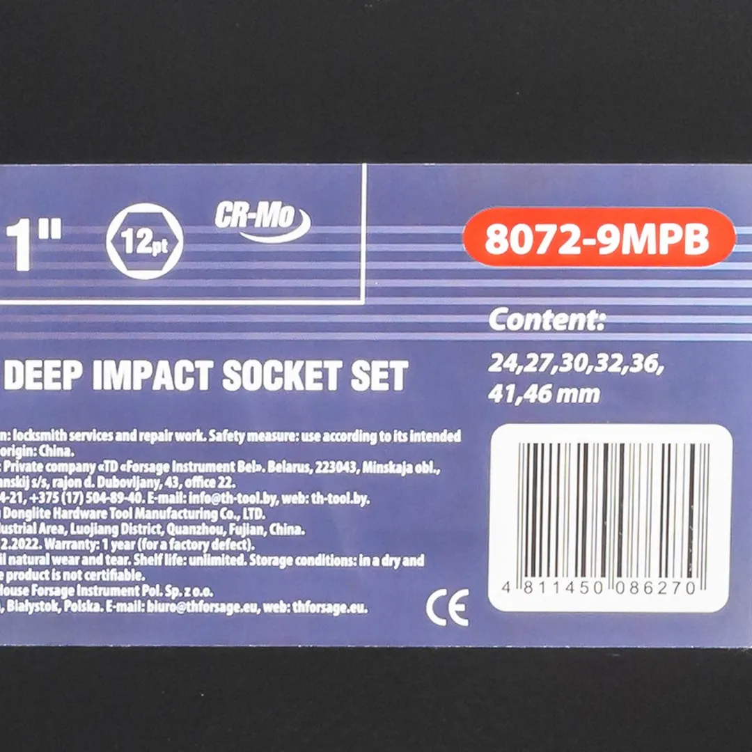 Набор головок ударных глубоких 1" 7 пр., 12-гр., 24-46 мм Forsage F-8072-9MPB, описание и характеристики: