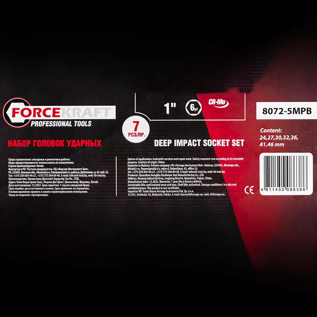 Набор головок ударных глубоких 1'' 7 пр. 6-гр 24- 46 мм ForceKraft FK-8072-5MPB, описание и характеристики: