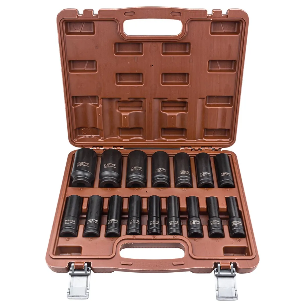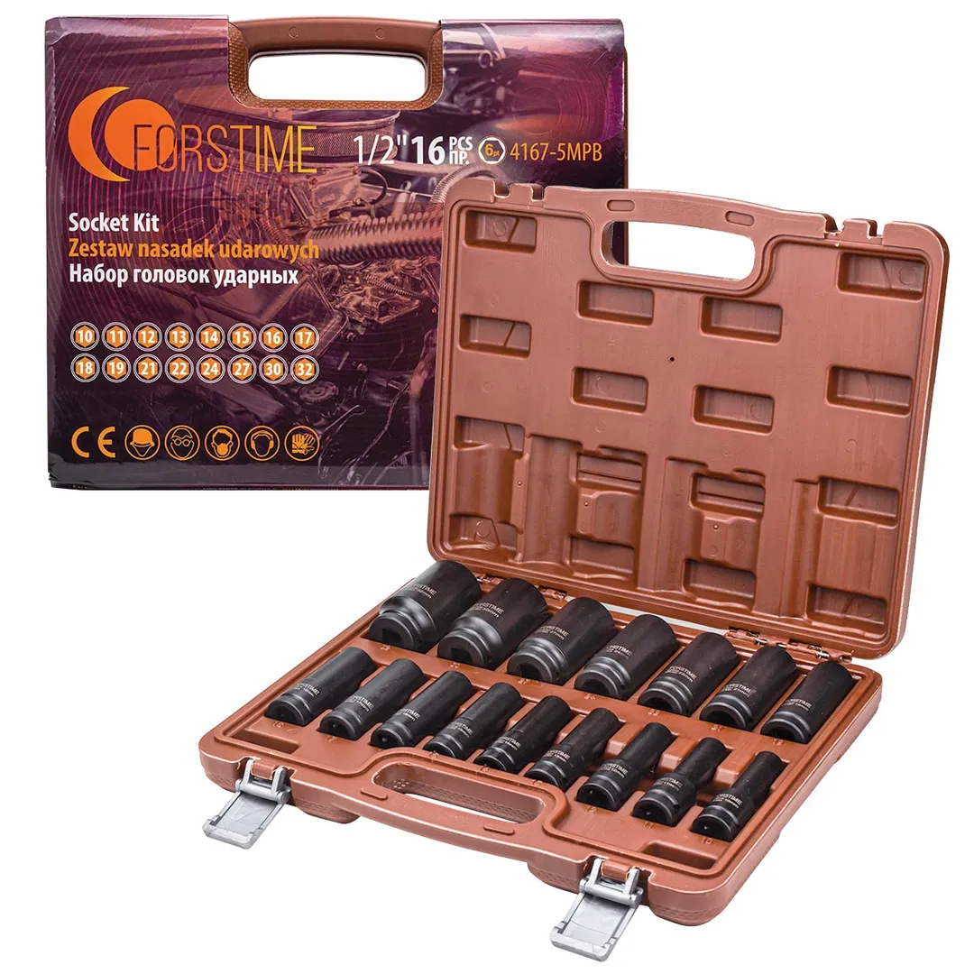 Набор головок ударных глубоких 10-19, 21, 22, 24, 27, 30, 32 мм 1/2'' 6-гр 16 пр FORSTIME FT-4167-5MPB