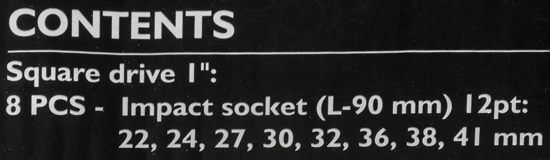 Набор головок ударных глубоких 8 пр. 1'', 12-гр, 22, 24, 27, 30, 32, 36, 38, 41 мм JCB JCB-8081-9MPB, описание и характеристики: