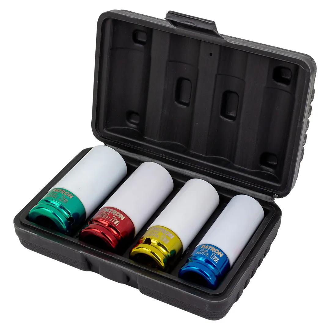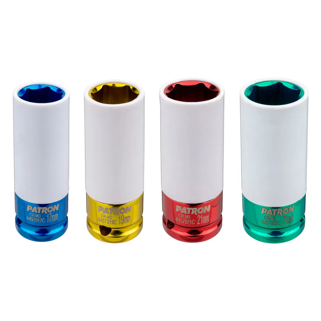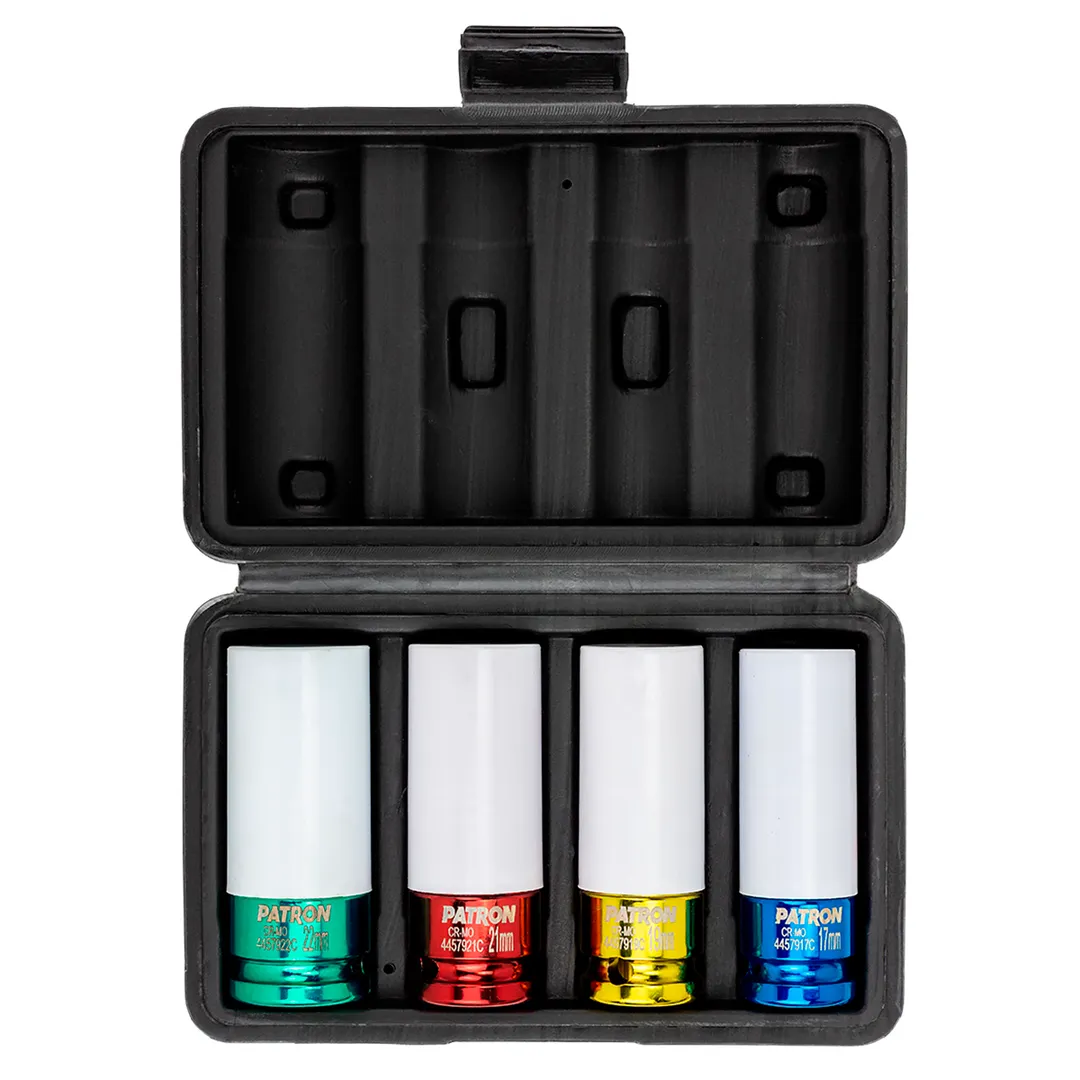Набор ударных глубоких тонкостенных головок 17, 19, 21, 22 мм в защитном кожухе 4 пр 1/2'' 6-гр PATRON P-4046