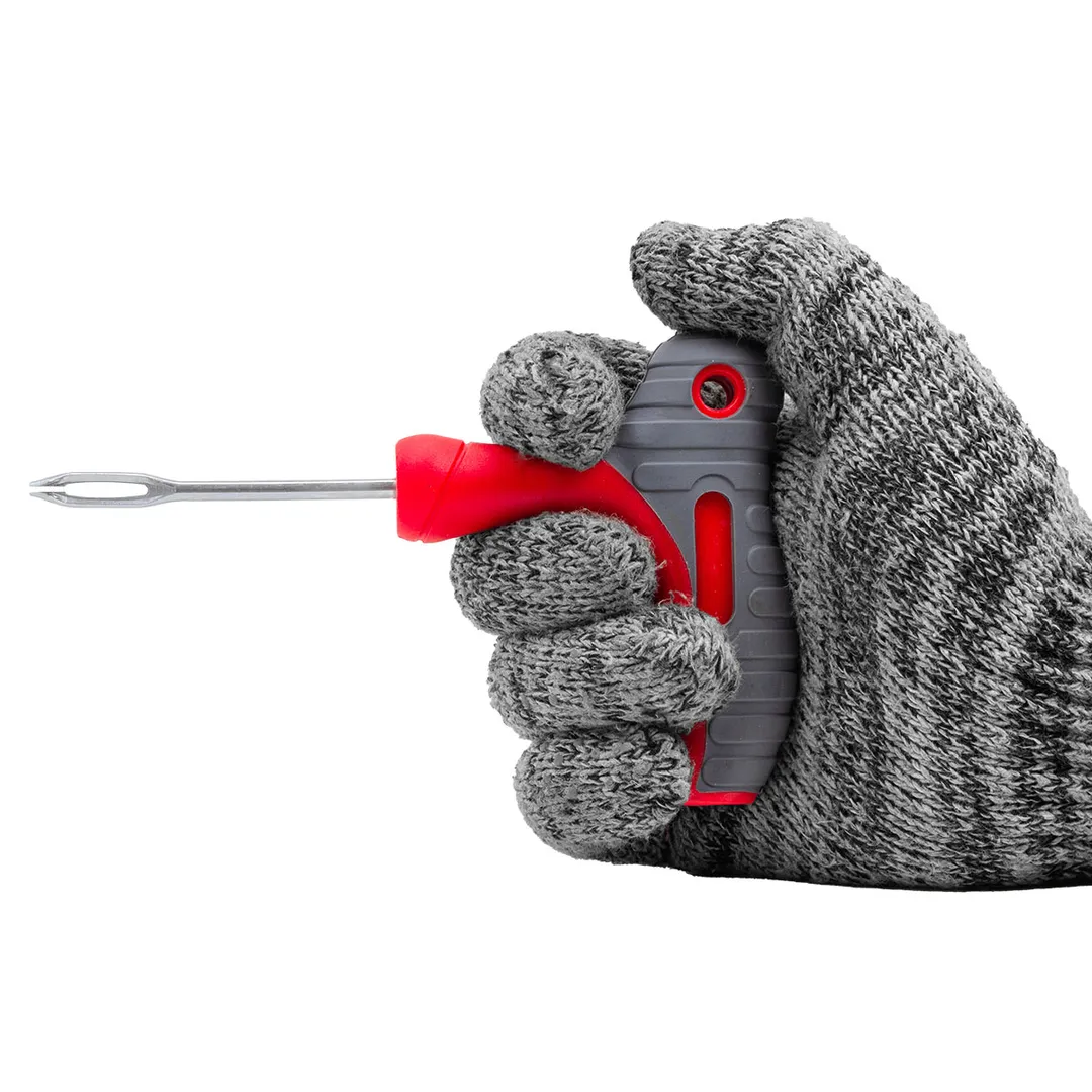 Набор инструментов для ремонта покрышек колес из 9 предметов обладает всеми необходимыми элементами, которые нужны для быстрой и качественной починки колес. Достоинства использования такого набора – это быстрый и качественный ремонт резины своими руками. Применять такой комплект можно как в гараже, так и в экстренных ситуациях при проколе колеса в пути. После этого колесо можно накачивать воздухом до нужного давления. В виду своей компактности набор легко поместиться в бардачке или багажнике, что позволит применять его при необходимости даже на дороге. Ремонт шин жгутами осуществляется по схеме: в отверстие вставляется смазанное клеем спиральное шило для смазки прокола, в ушко установочного шила протягивается жгут для колеса, жгут смазывается клеем, вставляется установочное шило до упора, резким движением шило для установки достается. Комплектация: жгуты 6мм х 4" 5 шт., шило для протяжки жгутов 1 шт., шило спиральное 1 шт., нож, клей.Преимущества работы с нами
