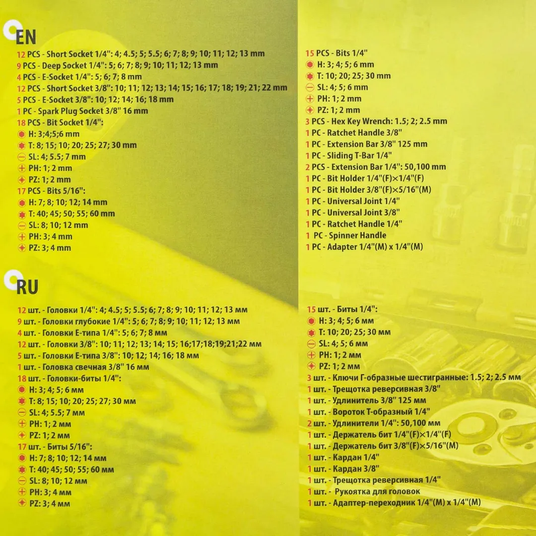 Профессиональный набор инструментов из 108 предметов в кейсе - удачный выбор для выполнения монтажных, слесарных и ремонтных работ. Набор имеет ряд достоинств, которые облегчают выполнение работ при обслуживании и ремонте автомобиля. Все торцевые головки, трещотки, воротки, карданы и удлинители изготовлены из прочной легированной стали, которая обладает повышенной устойчивостью к коррозии. Кроме стандартного набора рукояток, держателей бит, отверток, переходников, удлинителей и насадок, в этот набор инструментов в кейсе включена свечная головка 16 мм., а так же головки HEX и TORX, которые позволяют работать с крепежом в труднодоступных местах и применяются при ремонте двигателей. Комплектация инструментов с посадочным квадратом 1/4": головки (4, 4.5, 5, 5.5, 6, 7, 8, 9, 10, 11, 12, 13 мм.), головки глубокие (5, 6, 7, 8, 9, 10, 11, 12, 13 мм.), головки Е-профиль (E5, E6, E7, E8), битодержатель 1/4(F)x1/4(M), головки биты H (3, 4, 5, 6), T (8, 10, 15, 20, 25, 27, 30), SL (4, 5.5, 7), PH (1, 2), PZ (1, 2), биты H (3, 4, 5, 6), T (10, 20, 25, 30), SL (4, 5, 6), PH (1, 2), PZ (1, 2), рукоятка для головок, трещотка реверсивная, вороток Т-образный, кардан шарнирный, удлинители 50 и 100 мм. Комплектация инструментов с посадочным квадратом 3/8": биты 5/16""H (7, 8, 10, 12, 14), T (40, 45, 50, 55, 60), SL (8, 10, 12), PH (3, 4), PZ (3, 4), головки (10, 11, 12, 13, 14, 15, 16, 17, 18, 19, 21, 22 мм.), головки E-профиль (E10, E12, E14, E16, E18), головка свечная 16 мм., трещотка реверсивная, кардан шарнирный, удлинитель 125 мм., битодержатель 3/8(F)x5/16(M). Другие составляющие: ключи Г-образные (1.5, 2, 2.5 мм.), кейс. Все предметы хранятся в удобном пластиковом кейсе, который обеспечивает защиту инструментов от повреждений и удобен для транспортировки.