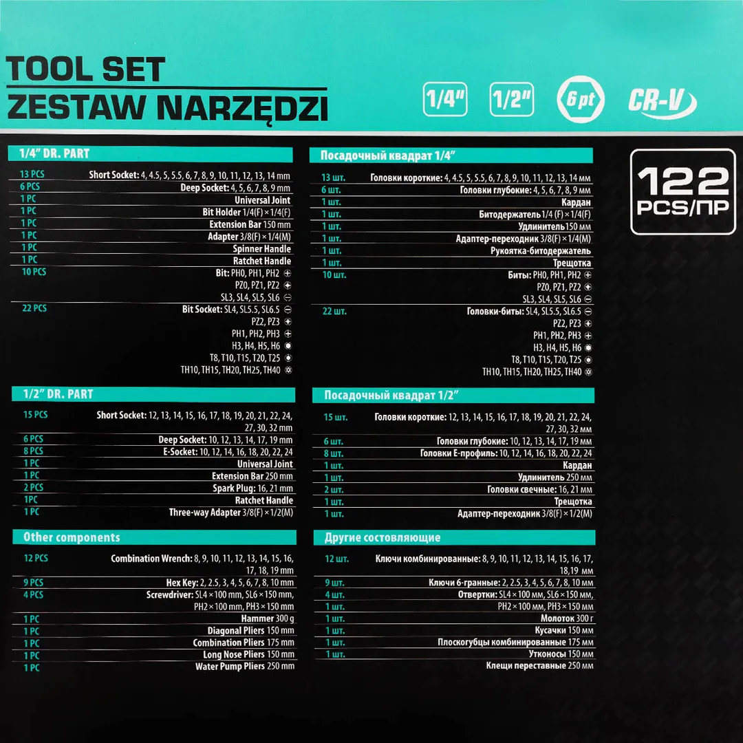 Набор инструментов 122 пр. 13 шт. - Головки короткие 1/4" : 4, 4.5, 5, 5.5, 6, 7, 8, 9, 10, 11, 12, 13, 14 мм 6 шт. - Головки глубокие 1/4" : 4, 5, 6, 7, 8, 9 мм 1 шт. - Кардан 1/4" 1 шт. - Битодержатель 1/4" " (F)x1/4" " (F) 1 шт. - Удлинитель 1/4" 150 мм 1 шт. - Адаптер-переходник 1/4" " 3/8(F)x1/4(M) 1 шт. - Рукоятка-битодержатель 1 шт. - Трещотка 1/4" 10 шт. - Биты 1/4" PH: 0, 1, 2 PZ: 0, 1, 2 SL: 3, 4, 5, 6 22 шт. - Головки-биты 1/4" : SL: 4, 5.5, 6.5 PZ : 2, 3 PH: 1, 2, 3 H: 3, 4, 5, 6 T: 8, 10, 15, 20, 25 TH: 10, 15, 20, 25, 40 15 шт. - Головки короткие 1/2" : 12, 13, 14, 15, 16, 17, 18, 19, 20, 21, 22, 24, 27, 30, 32 мм 9 шт. - Ключи 6-гранные: 2, 2.5, 3, 4, 5, 6, 7, 8, 10 мм 6 шт. - Головки глубокие 1/2" : 10, 12, 13, 14, 17, 19 мм 8 шт. - Головки Е-типа 1/2" : 10, 12, 14, 16, 18, 20, 22, 24 1 шт. - Кардан 1/2" 1 шт. - Удлинитель 1/2" 250 мм 2 шт. - Головки свечные 1/2" : 16, 21 мм 1 шт. - Трещотка 1/2" 1 шт. - Адаптер-переходник 3/8(F)x1/2(M) 12 шт. - Ключи комбинированные: 8, 9, 10, 11, 12, 13, 14, 15, 16, 17, 18, 19 мм 4 шт. - Отвертки: SL4x100 мм, SL6x150 мм, PH2x100 мм, PH3х150 мм 1 шт. - Молоток 300 г 1 шт. - Кусачки 150 мм 1 шт. - Плоскогубцы комбинированные 175 мм 1 шт. - Утконосы 150 мм 1 шт. - Клещи переставные 250 ммПреимущества работы с нами