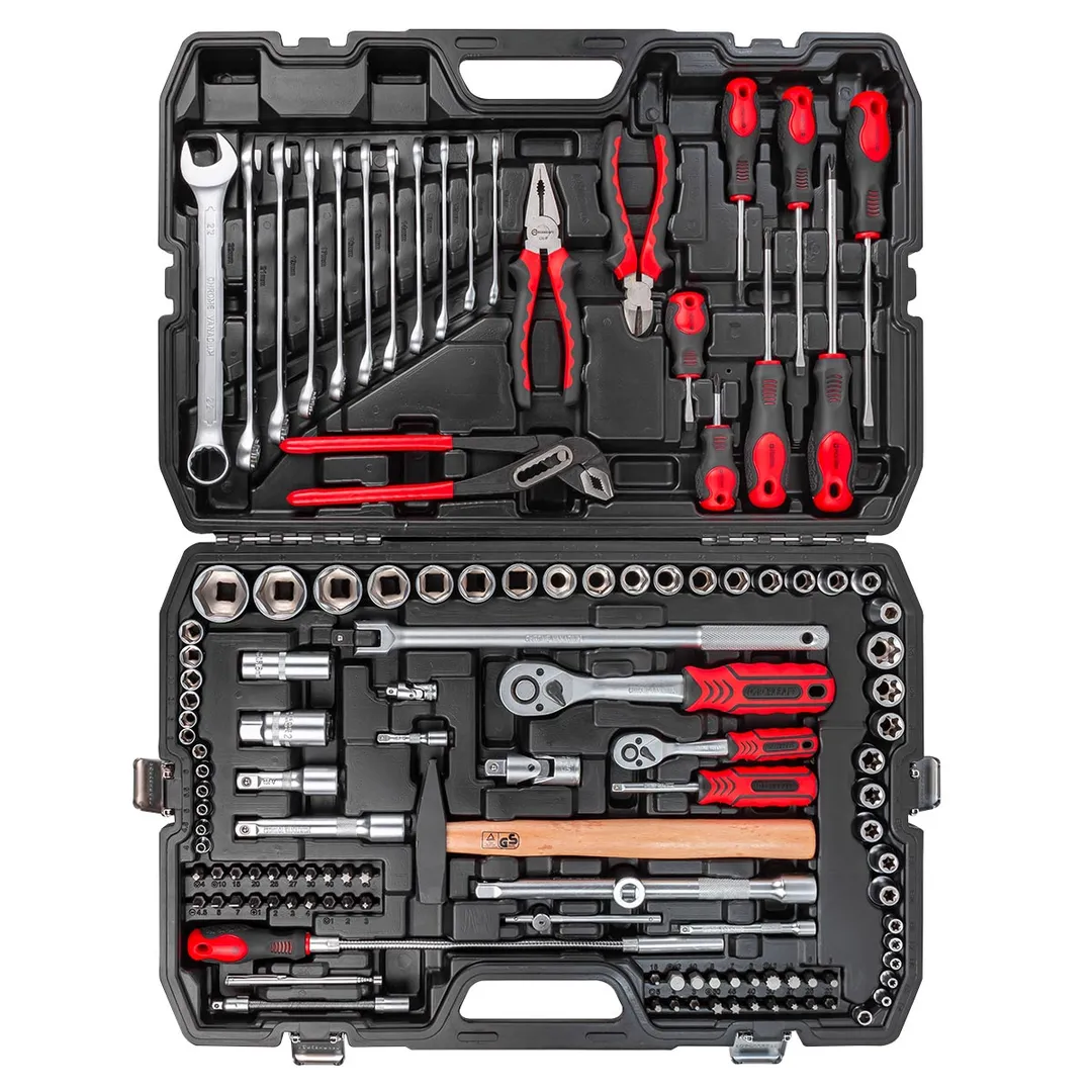 Набор инструментов из 124 предметов имеет уникальную комплектацию. Пригодится на СТО, в быту, в гараже. Благодаря набору вы сможете легко и быстро выполнять любые работы, связанные с автомобилями и другой техникой. Инструменты изготовлены из хромованадиевой стали (CR-V), обеспечивающие надежность и долговечность при использовании. Комплектация: торцевые головки 1/2" (8, 10, 11, 12, 13, 14, 15, 16, 17, 18, 19, 20, 21, 24, 27, 30, 32 мм.), торцевые головки 1/4" (4, 4.5, 5, 5.5, 6, 7, 8, 9, 10, 11, 12, 13 мм.), торцевые головки 1/2" Е-тип (Е10, E11, E12, E14, E16, E18, E20, E24), торцевые головки 1/4" Е-тип (E4, Е5, Е6, Е7, Е8), трещотка 1/2" и 1/4", Т-образный вороток 1/4", кардан 1/2" и 1/4", удлинители 1/2" (75, 125 и 250 мм.), удлинители 1/4" (50 и 100 мм.), головки свечные 1/2" (16 и 21 мм.), вороток шарнирный 1/2", гибкий удлинитель 1/4", битодержатель 1/4" (F)x1/4" HEX(F), битодержатель 1/2" (F)x5/16" HEX(F) комбинированные ключи (8, 10, 12, 13, 14, 15, 16, 17, 19, 21, 22 мм.), магнитный извлекатель, пассатижи комбинированные 175 мм, пассатижи переставные 250 мм, молоток с деревянной ручкой 300г, отвертки 7 шт (РН2х38, РН1х75, РН2х100, РН3х150, SL5.5x38, SL5.5x125, SL6.5x150), отвертка под биты 1/4", биты 1/4" 20шт (T15, T20, T25, T27, T30, T40, T45, T50, H3, H4, H5, H6, H7, H8, H10, H12, M6, M8, M10, M12), биты 5/16" 20шт (T10, T15, T20, T25, T27, T30, T40, T45, T50, SL4.5, SL5, SL7, PH1, PH2, PH3, PH4, PZ1, PZ2, PZ3, PZ4) бокорезы 150 мм, кейс.Преимущества работы с нами