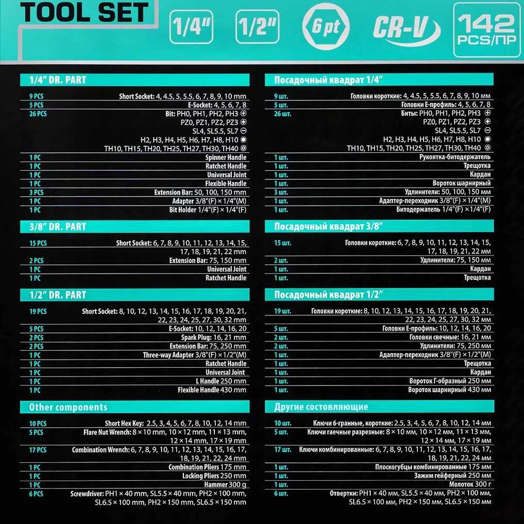 Набор инструментов 142 пр. 1/4''&1/2'' 6-гр MAMEDFORCE MF-41421-5, описание и характеристики:
