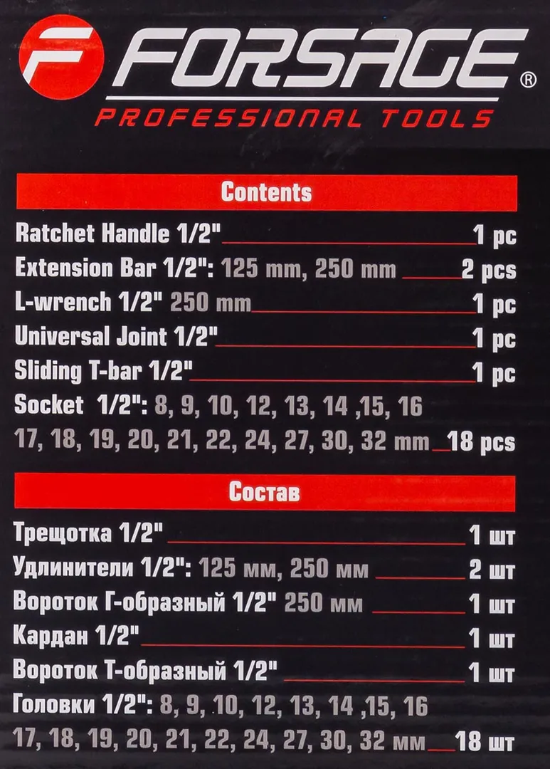 Набор инструментов 24 пр. 1/2'', 6-гр Forsage F-4245B-5MPB, описание и характеристики: