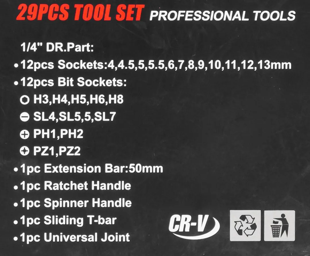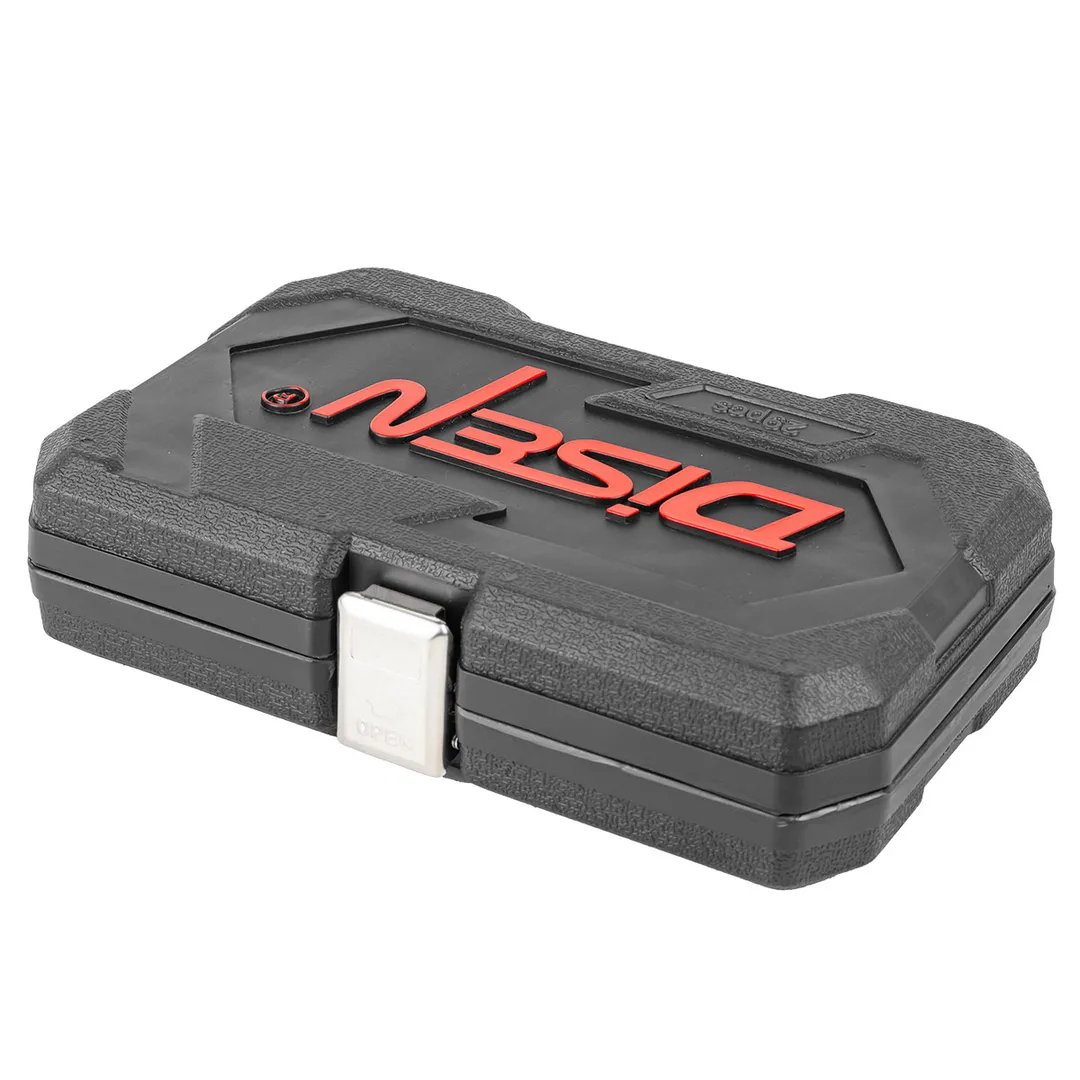 Универсальный набор инструментов Disen из 29 предметов в кейсе - применим для мелкого ремонта на СТО, в гараже, в дороге, на даче и дома в быту. Подойдет автолюбителям при мелком ремонте: заменить лампочку, открутить панель, снять аккумулятор, хомут и др. А дома собрать или разобрать мебель, установить сантехнику, отремонтировать садовую и бытовую технику и многое другое. Набор станет незаменимым помощником в любой работе. Посадочный квадрат 1/4" . Изготовлен из хром ванадия CR-V. Комплектация: трещотка, головки торцевые (4, 4.5, 5, 5.5, 6, 7, 8, 9, 10, 11, 12, 13 мм.), удлинитель 50 мм., рукоятка, кардан шарнирный, биты 12 шт. (SL, PH, PZ, Н), вороток Т-образный, кейс. Для удобства хранения и транспортировки поставляется в прочном пластиковом кейсе с металлической защелкой - отличный подарок мужу, брату, свату, коллеге! Набор станет незаменимым помощником в дороге!Преимущества работы с нами