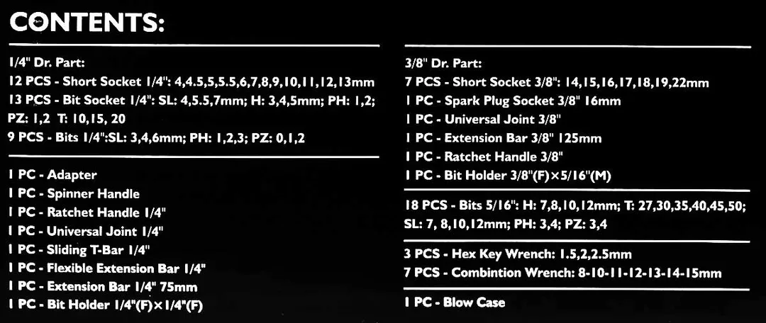 Набор инструментов для выполнения слесарных, ремонтных, монтажных работ. Набор имеет ряд достоинств, которые позволяют значительно облегчить выполнение работ при обслуживании и ремонте автомобильного средства. Все составляющие комплекта упакованы в пластиковый кейс с металлическими защёлками, где у каждого предмета своя ячейка хранения. Инструменты изготовлены из высококачественной хромованадиевой стали, что обеспечивает их прочность, долговечность и надежность. Включает самые необходимые инструменты для любого типа ремонта автомобиля, включая свечи зажигания, тормоза и обслуживание двигателя. Комплектация: головки 1/4"короткие (4, 4.5, 5, 5.5, 6, 7, 8, 9, 10, 11, 12, 13, 14 мм.), головки 3/8"короткие (14, 15, 16, 17, 18, 19, 22 мм.), головка свечная 3/8"16 мм., головки-биты 1/4"HEX 35 мм. (3, 4, 5 мм.), головки-биты 1/4"TORX 35 мм. (T10, T15, T20), головки-биты 1/4"SL (4, 5.5, 7), головки-биты 1/4"РН (РН.1, РН.2), головки-биты 1/4"PZ (PZ.1, PZ.2), биты 5/16"HEX (7, 8, 10, 12 мм.), биты 5/16"TORX (Т27, Т30, Т35, Т40, Т45, Т50), биты 5/16"SL (7, 8, 10, 12), биты 5/16"PH (PH.3, PH.4), биты 5/16"PZ (PZ.3, PZ.4), биты 1/4"SL (3, 4, 6), биты 1/4"PH (PH 1, PH.2, PH.3), биты 1/4"PZ (PZ.0, PZ.1, PZ.2), адаптер, рукоятка для головок, трещотка реверсивная 1/4", кардан 1/4", вороток Т-образный 1/4", удлинитель гибкий 1/4", удлинитель 1/4"75 мм., кардан 3/8", удлинитель 3/8"125 мм., трещотка реверсивная 3/8", битодержатели 1/4"и 3/8", ключи Г-образные шестигранные (1.5, 2, 2.5 мм.), ключи комбинированные (8, 10, 11, 12, 13, 14, 15 мм.), кейс.Преимущества работы с нами