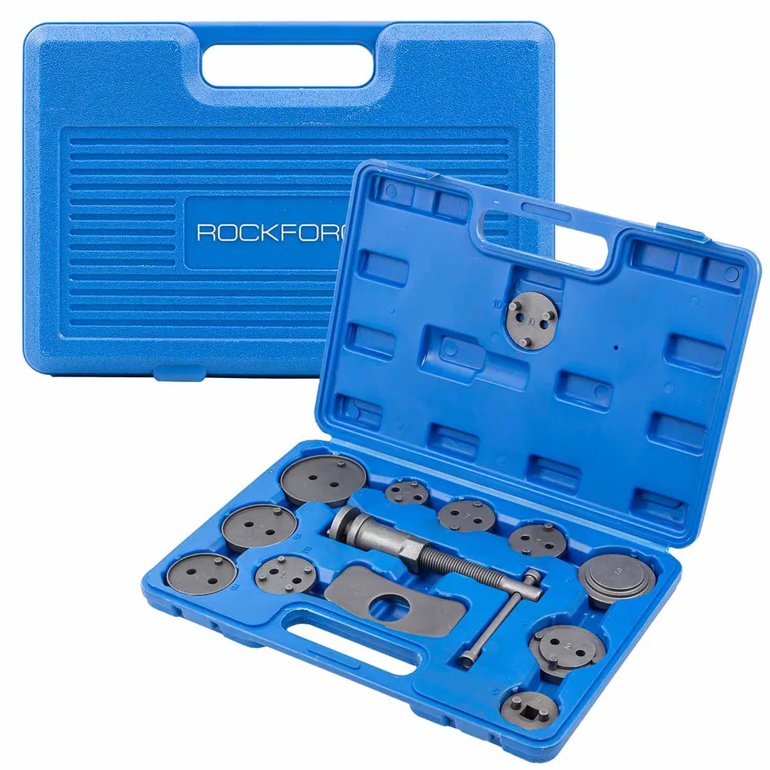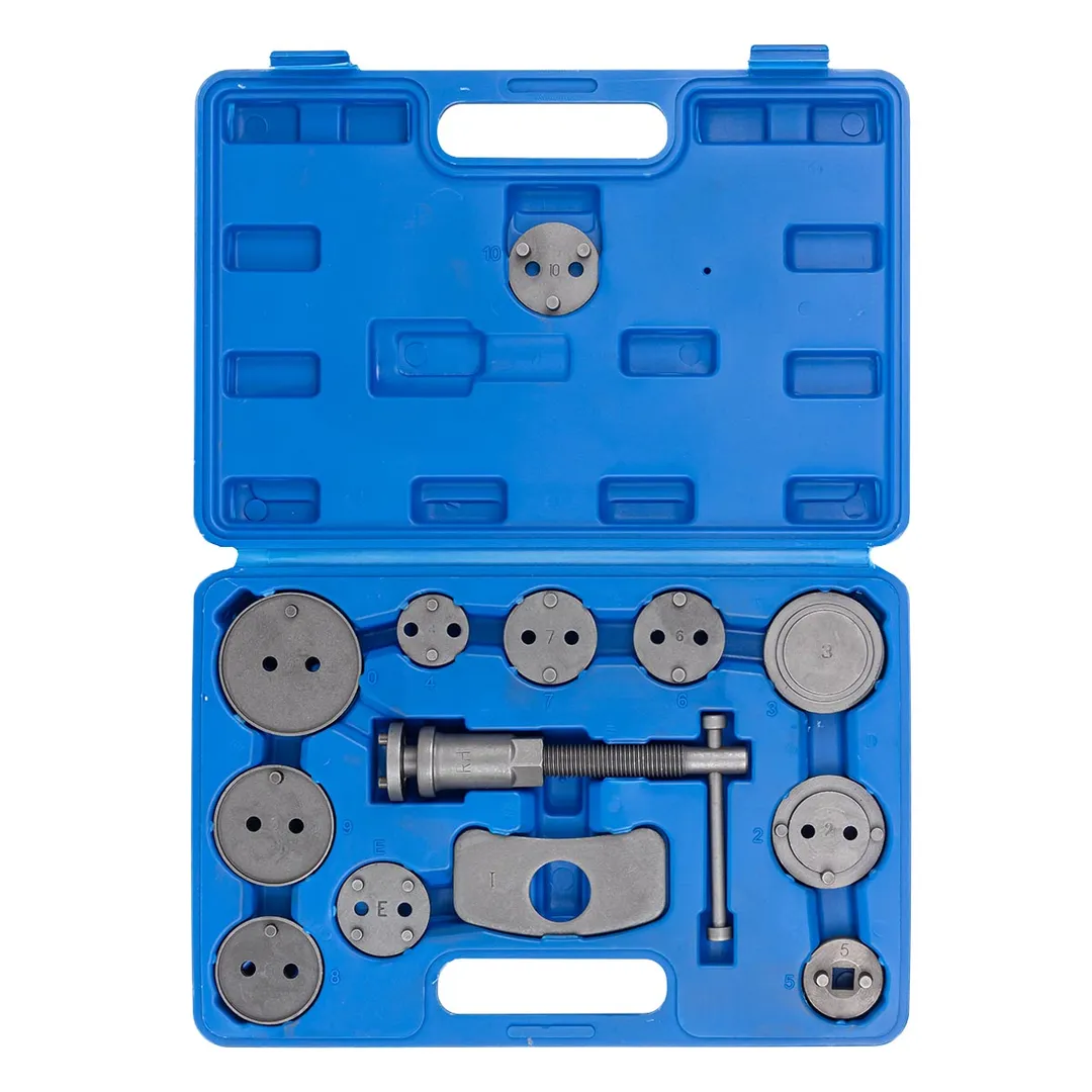 Набор инструментов для обслуживания тормозных цилиндров 13 предметов в кейсе. Приспособление для возврата поршней цилиндров дисковых тормозов в наборе. Набор для возврата поршней дисковых тормозных механизмов применяется при ремонте и обслуживании суппортов дисковых тормозов легковых автомобилей. Принцип действия данного инструмента основан на воздействии путем совмещения двух усилий, вращательного, перпендикулярно оси вращения поршня и осевого, для возврата в исходное положение поршня рабочего цилиндра тормозного суппорта.Преимущества работы с нами