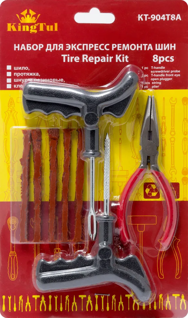 Набор инструментов для ремонта шин 8 пр., шило, протяжка, шнуры-5 шт, утконосы, KINGTUL KT-904T8A