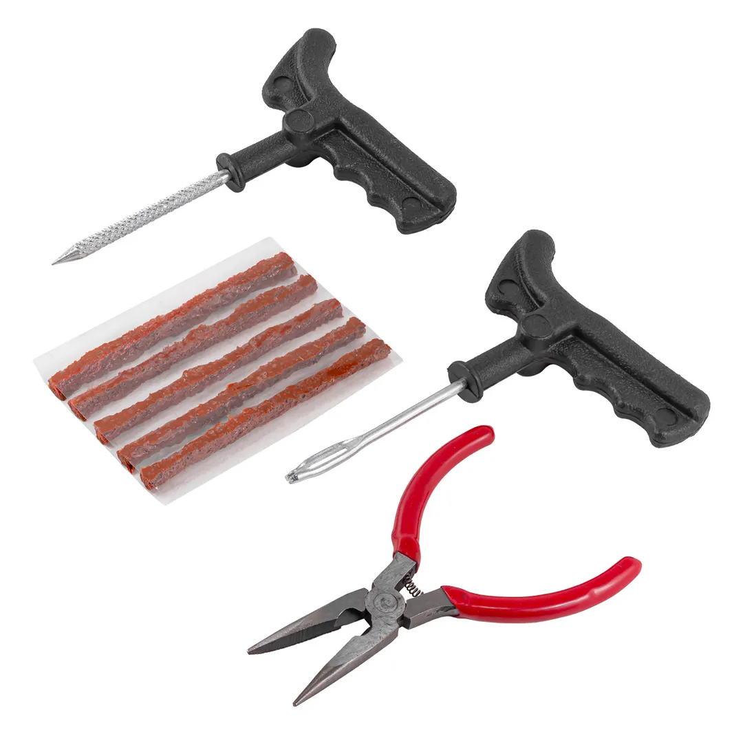 Набор для ремонта бескамерных шин просто использовать, так что вам даже не необязательно иметь практический опыт по ремонту вашего автомобиля. Ремкомплект обладает всеми необходимыми элементами, которые нужны для быстрой и качественной починки колес. Достоинства использования такого набора – это быстрый и качественный ремонт резины своими руками. Применять такой комплект можно как в гараже, так и в экстренных ситуациях при проколе колеса в пути. Использование такого метода показало, что на выполнение всей работы уходит примерно от 10 до15 минут. После этого колесо можно накачивать воздухом до нужного давления. В виду своей компактности наш набор легко поместиться в бардачке или багажнике, что позволит вам применять его при необходимости даже на дороге. Наш комплект для ремонта резины – это набор инструментов и аксессуаров в составе которого вы найдёте: Рашпиль- специальный инструмент, главная задача которого – создание ровного круглого отверстия на месте прокола колеса. Использование этого приспособления упростит последующий ремонт и латание дыры на покрышке. Шило – острый инструмент, имеющий отверстие в игле. При его помощи вы заклеите дыру в шине автомобиля. Жгут – основной материал, который предназначен для заполнения места прокола. Миниутконосы прямые.Преимущества работы с нами