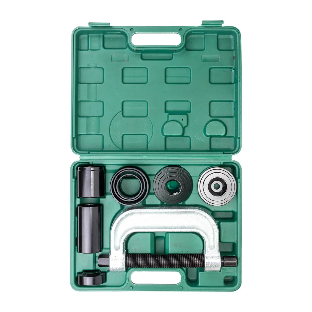 Набор предназначен для сборки или разборки запрессовываемых элементов, таких как шаровые опоры, пальцы тормозных колодок и др. Комплект упакован в прочный пластиковый кейс. Инструменты изготовлены из чугуна и закаленной углеродистой стали. Применяется для автомобилей с полным приводом 4WD, оборудоваными карданным валом типа Dana 44, который встречается в автомобилях марок FORD, GM, DODGE, IHC, JEEP. СОДЕРЖАНИЕ КОМПЛЕКТА: С-образный шнековый пресс; центрирующий штифт; 3 сквозных оправки размером [диаметр x длина]: 2-3/4" x 3", 2-1/4" x 2-1/2", 1-3/4" x 2" (44/50 мм x 46 мм 57/63 мм х 45 мм, 70/76 мм х 60 мм); адаптер для внешнего монтажа [диаметр x длина]: 2-1/4" x 0,845" (48/52 мм x 21 мм); внутренняя монтажная втулка 1-3/4" (46/50 x 63 мм); внешний адаптер [диаметр x длина]: 2-1/4" x 2-1/2" (51/57 мм x 63 мм); внутренний ступенчатый монтажный адаптер 0,941”; внешний 1/2” ступенчатый демонтажный адаптер.Преимущества работы с нами