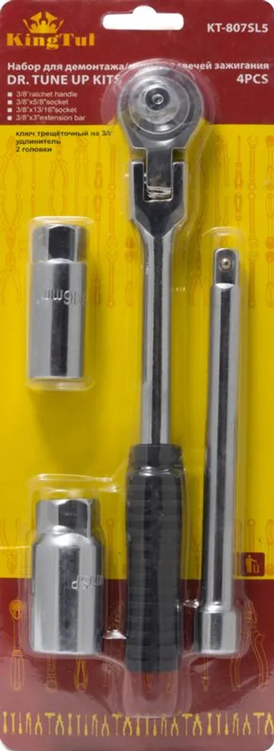 Набор инструментов для свечей зажигания 4 пр., 3/8'', 16 мм, 21 мм, удлинитель-150 мм, трещотка шарнирная-225 мм, KINGTUL KT-807SL5