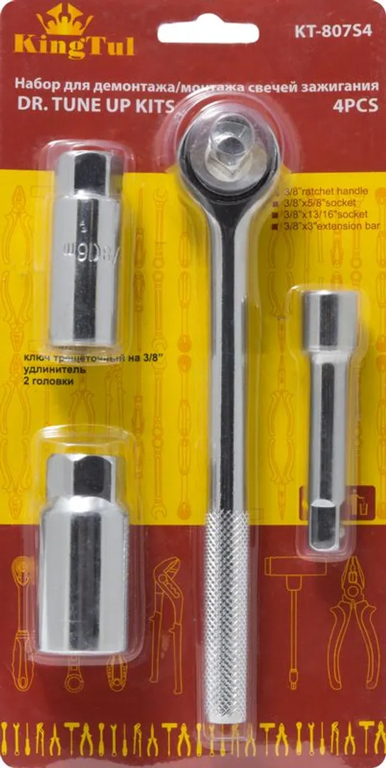 Набор инструментов для свечей зажигания 4 пр., 3/8'', 16 мм, 21 мм, удлинитель-75 мм, трещотка-180 мм, KINGTUL KT-807S4