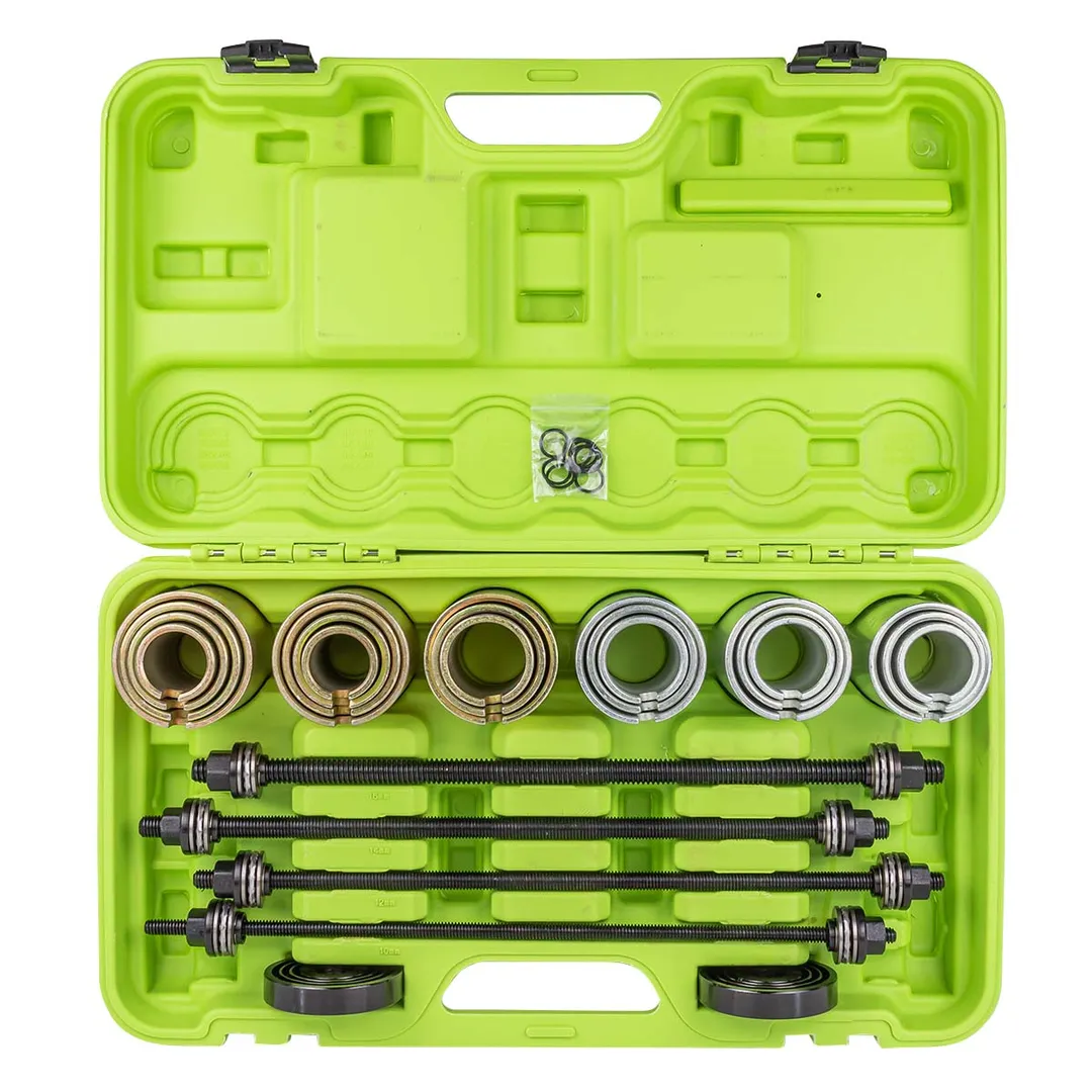 Набор инструментов для снятия и установки втулок, подшипников и сайлентблоков универсальный. В данный набор инструментов, позволяющий снимать и монтировать втулки, подшипники и сайлентблоки входит 26 предметов, предназначен для работ с валами и резьбовыми соединениями М10, 12, 14 и 16, а также множеством типоразмеров цилиндрических и конусовидных резиновых втулок. Материал: углеродистая сталь. Толщина стенки 5 мм. Высота оправы: 94 мм. Внешний диаметр: 44, 46, 48, 50, 52, 54, 56, 58, 60, 62, 64, 66, 68, 70, 72, 74, 76, 78, 80, 82 мм. Заглушки: 83 x 20 мм. Силовая резьба: M10 x 1.5, M12 x 1.5, M14 x 1.5, M16 x 1.5 мм. Длина винтов: 450 мм. Профессиональный инструмент - гарантия качества! Особое преимущество данного комплекта заключается в универсальности. Имея его в своем распоряжении, мастеру не придется тратиться на покупку дорогого специализированного инструмента для ремонта конкретных моделей автомобилей. Для удобства хранения и транспортировки поставляется в прочном пластиковом кейсе.Преимущества работы с нами