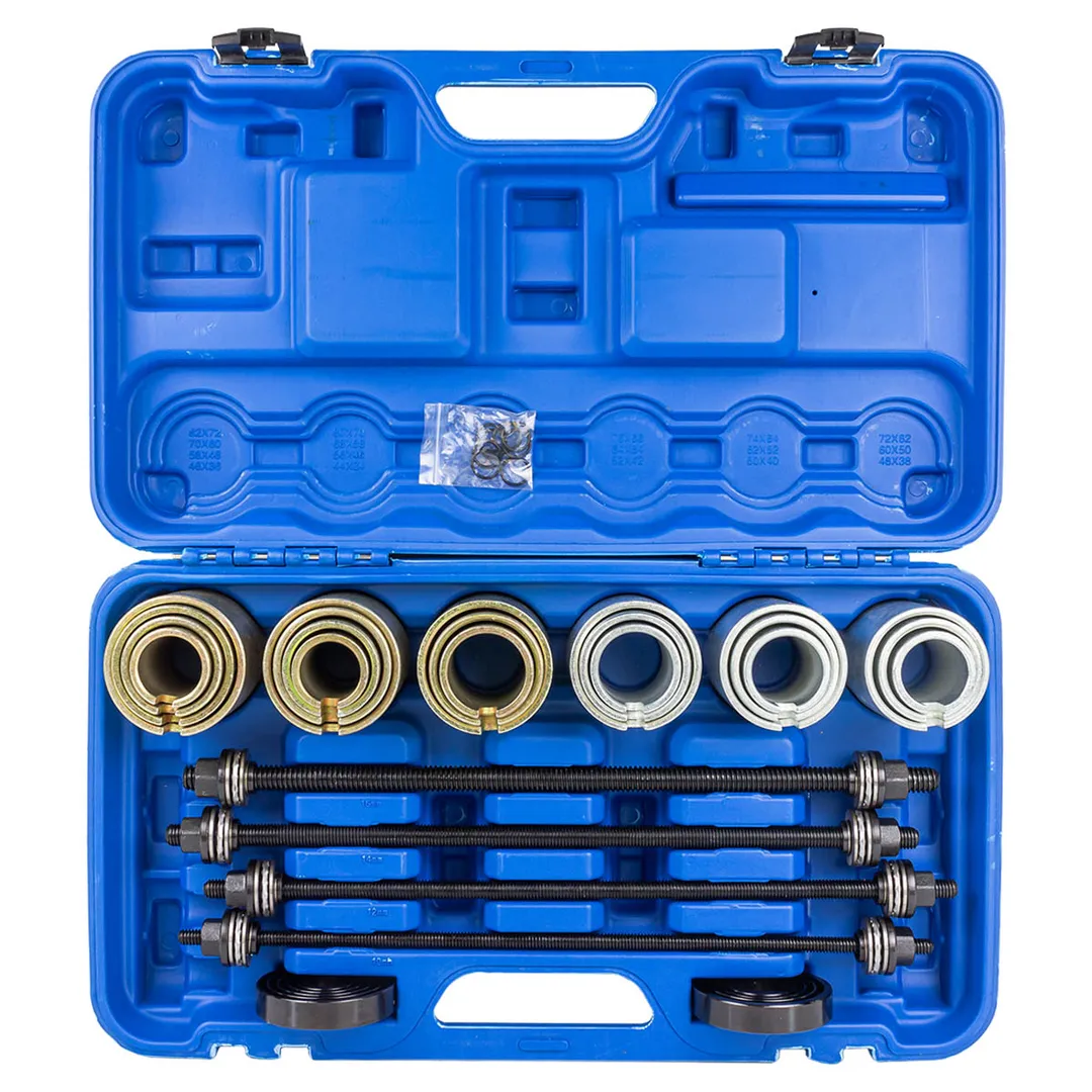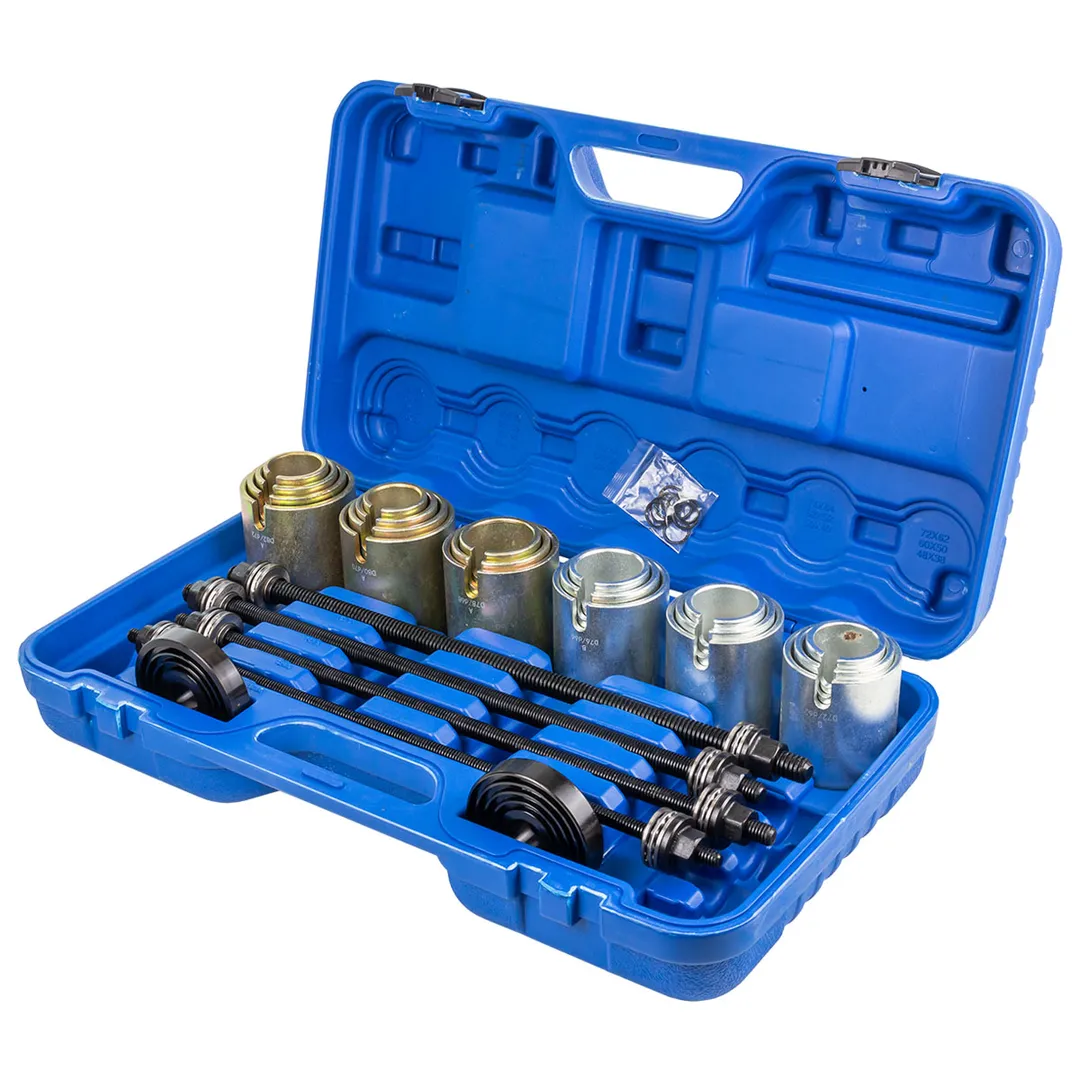 Набор инструментов для снятия и установки втулок, подшипников и сайлентблоков универсальный. В данный набор инструментов, позволяющий снимать и монтировать втулки, подшипники и сайлентблоки входит 26 предметов, предназначен для работ с валами и резьбовыми соединениями М10, 12, 14 и 16, а также множеством типоразмеров цилиндрических и конусовидных резиновых втулок. Материал: углеродистая сталь. Толщина стенки 5 мм. Высота оправы: 94 мм. Внешний диаметр: 44, 46, 48, 50, 52, 54, 56, 58, 60, 62, 64, 66, 68, 70, 72, 74, 76, 78, 80, 82 мм. Заглушки: 83 x 20 мм. Силовая резьба: M10 x 1.5, M12 x 1.5, M14 x 1.5, M16 x 1.5 мм. Длина винтов: 450 мм. Профессиональный инструмент - гарантия качества! Особое преимущество данного комплекта заключается в универсальности. Имея его в своем распоряжении, мастеру не придется тратиться на покупку дорогого специализированного инструмента для ремонта конкретных моделей автомобилей. Для удобства хранения и транспортировки поставляется в прочном пластиковом кейсе.Преимущества работы с нами