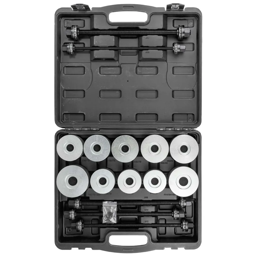 Набор для замены сайлентблоков, втулок и подшипников 27пр, в кейсе. Комплект монтажных и демонтажных приспособлений предназначен для мастеров автосервисных предприятий и станций СТО, специализирующихся на ремонте ходовой части автомобилей. Предлагаемый набор для замены резиномеханических шарниров, втулок и подшипников включает в себя съемники, винты, гильзы и другие инструменты, позволяющие вытягивать и устанавливать шарикоподшипники в опоры задних и передних колес, а также снимать и монтировать все виды резиновых уплотнений. Все составляющие данного набора для монтажа ‒ демонтажа сайленблоков, втулок и подшипников изготовлены из специальных марок сталей и отличаются высокой прочностью. Чтобы обеспечить сохранность элементов оснастки в процессе эксплуатации, комплект поставляется в надежном полимерном кейсе. M10, M12, M14, M16 Внутренний диаметр: 34, 36, 38, 40, 42, 44, 46, 48, 50, 52, 54, 56, 58, 60, 62, 64, 66, 68, 70, 72, 75, 80 мм Внешний диаметр: 44, 46, 48, 50, 52, 54, 56, 58, 60, 62, 64, 66, 68, 70, 72, 74, 76, 78, 80, 82, 85, 90 ммПреимущества работы с нами