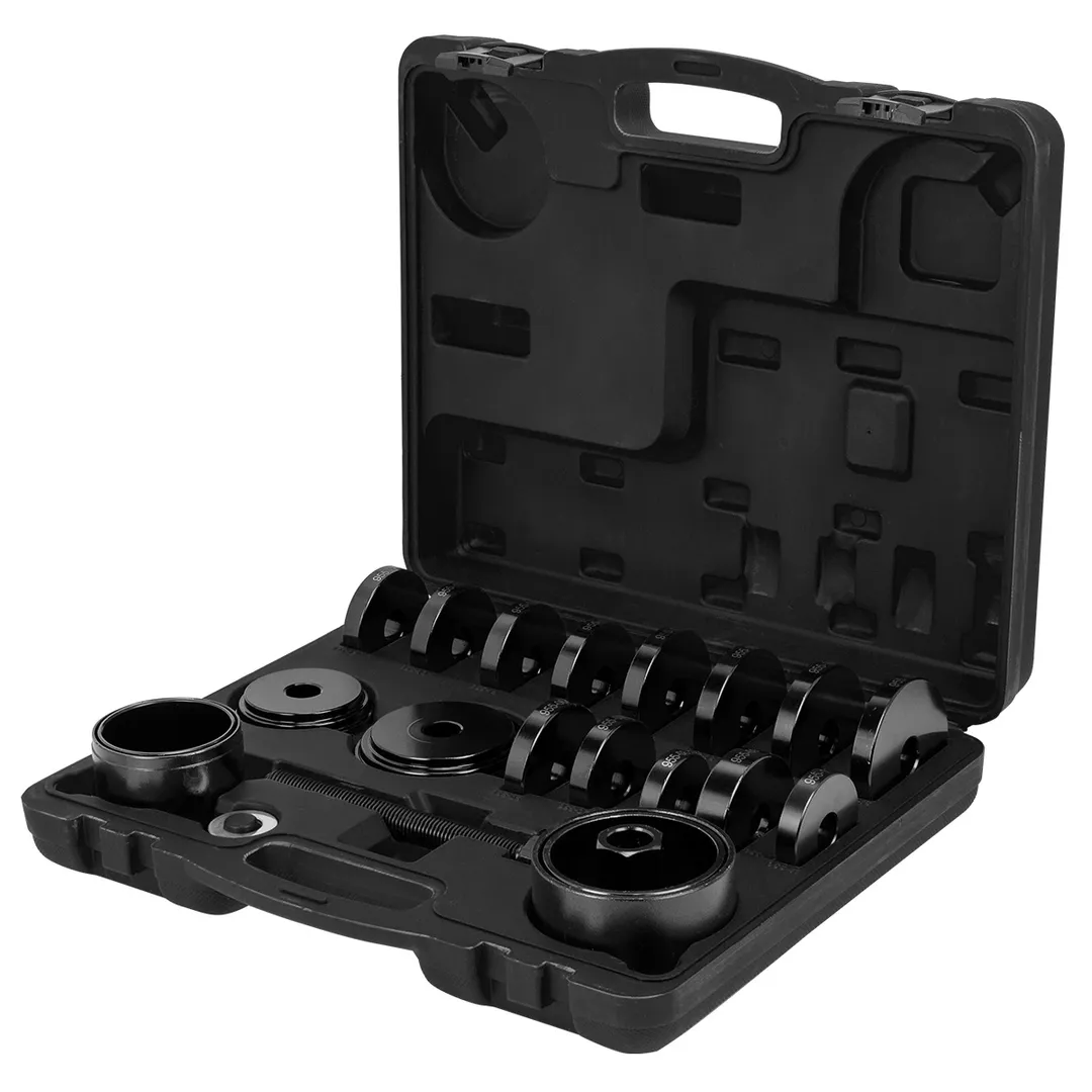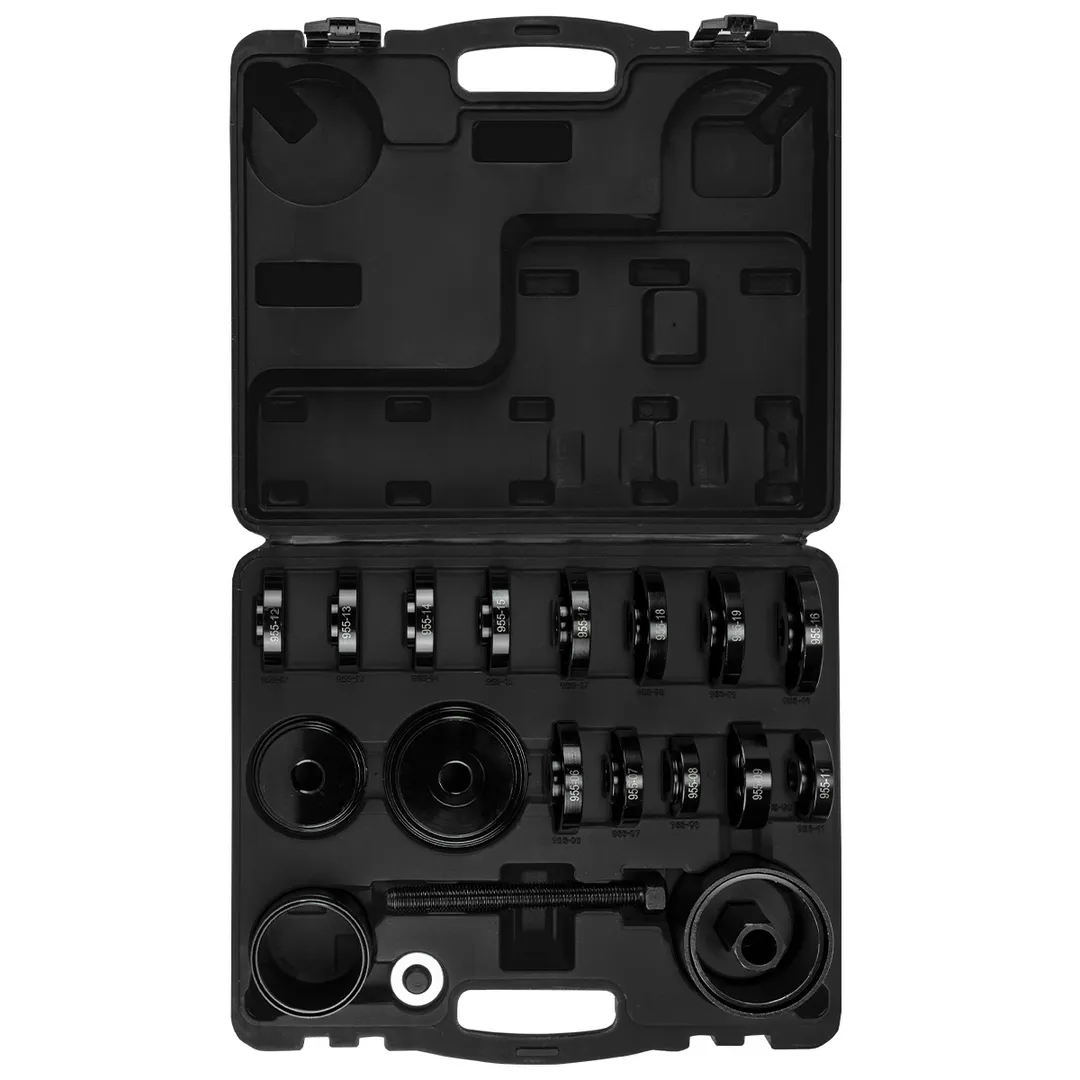 Набор инструментов для замены ступичных подшипников в пластиков кейсе. При сборке механизма или замене изношенных элементов металлические оправки помогают правильно позиционировать и надежно запрессовать подшипники или втулки в их место. Поставляется в прочном кейсе для удобства транспортировки и хранения. Изготовлены из закалённой стали, что гарантирует высокую прочность, стойкость к изломам, длительный период эксплуатации. Комплектация: Силовой винт Регулировочная гайка Опорные диски 55, 60, 63, 65, 70, 71.5, 73, 75, 77, 81, 83, 88мм 4 втулки 2 шайбы.Преимущества работы с нами