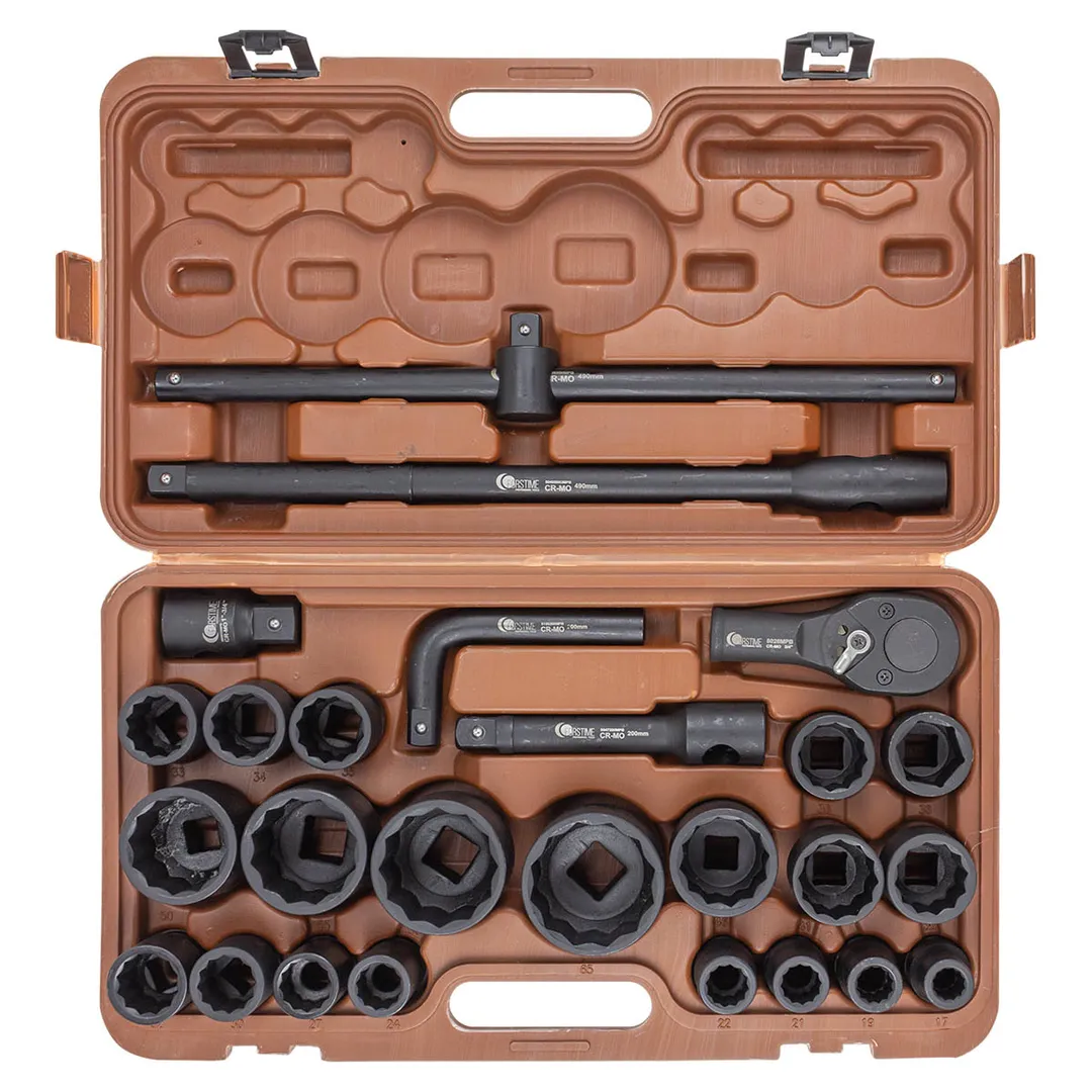 Набор инструментов ударных с посадочным квадратом 3/4" " и 1" . Набор включает в себя ударные головки, трещотку, воротки и удлинители. Они изготовлены из высококачественной хромомолибденовой стали (Cr-MO), что обеспечивает им прочность и долговечность. Головки ударные предназначены для зажима/разжима деталей и другой работы внутри механизмов. Они могут использоваться в автомобильном ремонте, строительстве, промышленных процессах и других областях. Способны выдерживать значительные нагрузки и удары, что позволяет работать с более тугими крепежными элементами и устойчивы к повреждениям. Трещотка и воротки используются вместе с головками для зажима/разжима внутри различных механизмов. Удлинители применяются при работе в труднодоступных местах. Незаменимый инструмент в арсенале любого автомеханика или промышленного работника, который работает с крепежными элементами. Они обеспечивают быстрое и эффективное решение задач, связанных с крепежом. Комплектация: Головки ударные 12-гранные 3/4" : 17-19-21-22-24-27-30-32-33-34-35-36-36(6-гран.)-38-41-46-50 мм; Головки ударные 12-гранные 1" : 55-60-65 мм; Трещотка 3/4" 500мм; Адаптер 3/4" (F)-1" (M); Удлинитель под вороток 490мм; Удлинитель под вороток 200мм; Вороток Г-образный 200мм; Вороток Т-образный 490 мм.Преимущества работы с нами