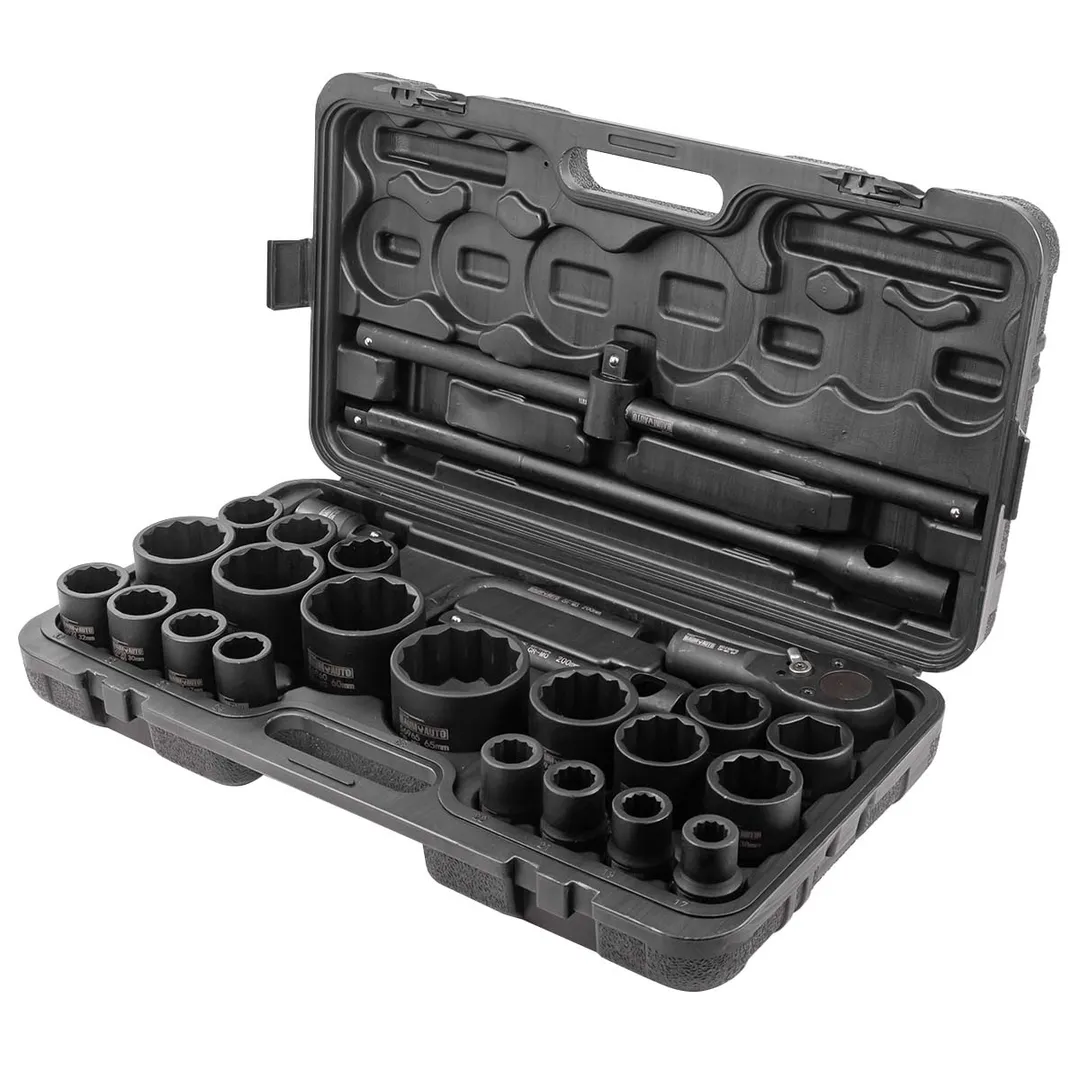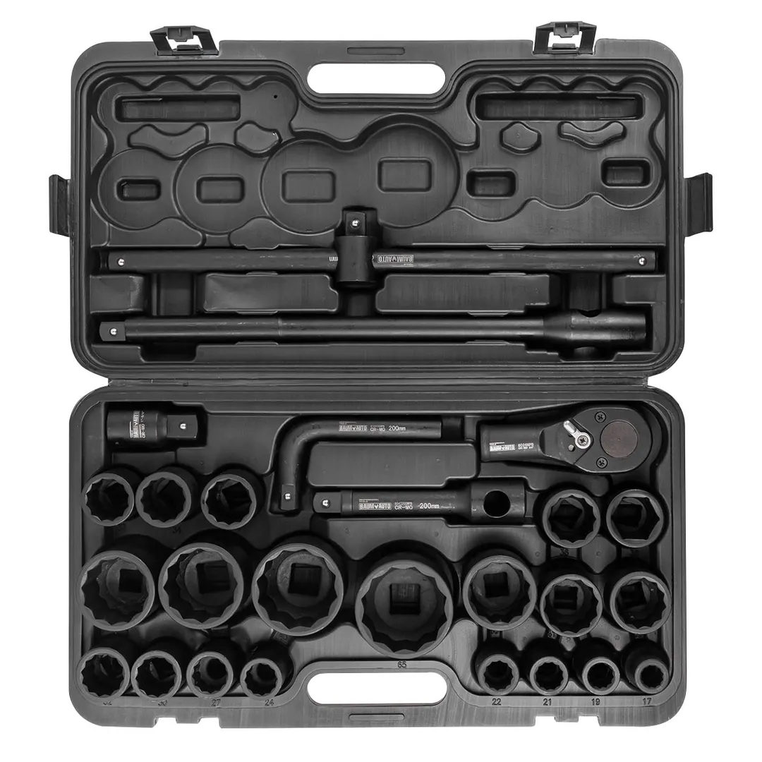 Набор инструментов ударных с посадочным квадратом 3/4" " и 1" . Набор включает в себя ударные головки, трещотку, воротки и удлинители. Они изготовлены из высококачественной хромомолибденовой стали (Cr-MO), что обеспечивает им прочность и долговечность. Головки ударные предназначены для зажима/разжима деталей и другой работы внутри механизмов. Они могут использоваться в автомобильном ремонте, строительстве, промышленных процессах и других областях. Способны выдерживать значительные нагрузки и удары, что позволяет работать с более тугими крепежными элементами и устойчивы к повреждениям. Трещотка и воротки используются вместе с головками для зажима/разжима внутри различных механизмов. Удлинители применяются при работе в труднодоступных местах. Незаменимый инструмент в арсенале любого автомеханика или промышленного работника, который работает с крепежными элементами. Они обеспечивают быстрое и эффективное решение задач, связанных с крепежом. Комплектация: Головки ударные 12-гранные 3/4" : 17-19-21-22-24-27-30-32-33-34-35-36-36(6-гран.)-38-41-46-50 мм; Головки ударные 12-гранные 1" : 55-60-65 мм; Трещотка 3/4" 500мм; Адаптер 3/4" (F)-1" (M); Удлинитель под вороток 490мм; Удлинитель под вороток 200мм; Вороток Г-образный 200мм; Вороток Т-образный 490 мм.Преимущества работы с нами