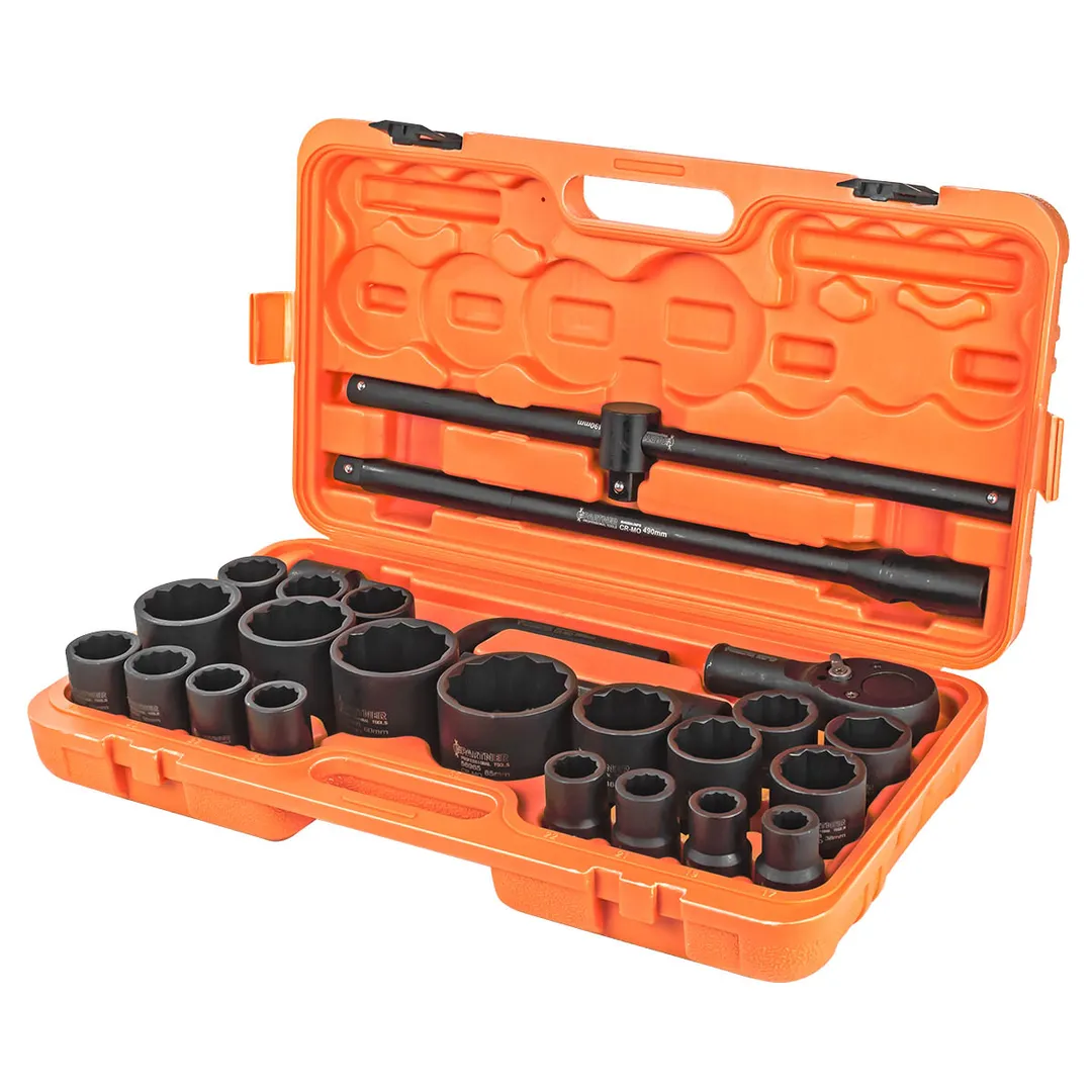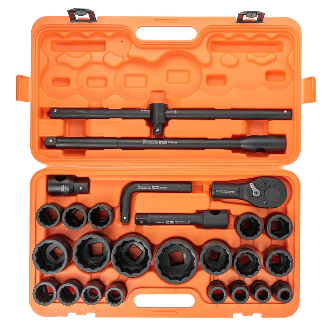 Набор инструментов ударных с посадочным квадратом 3/4" " и 1" . Набор включает в себя ударные головки, трещотку, воротки и удлинители. Они изготовлены из высококачественной хромомолибденовой стали (Cr-MO), что обеспечивает им прочность и долговечность. Головки ударные предназначены для зажима/разжима деталей и другой работы внутри механизмов. Они могут использоваться в автомобильном ремонте, строительстве, промышленных процессах и других областях. Способны выдерживать значительные нагрузки и удары, что позволяет работать с более тугими крепежными элементами и устойчивы к повреждениям. Трещотка и воротки используются вместе с головками для зажима/разжима внутри различных механизмов. Удлинители применяются при работе в труднодоступных местах. Незаменимый инструмент в арсенале любого автомеханика или промышленного работника, который работает с крепежными элементами. Они обеспечивают быстрое и эффективное решение задач, связанных с крепежом. Комплектация: Головки ударные 12-гранные 3/4" : 17-19-21-22-24-27-30-32-33-34-35-36-36(6-гран.)-38-41-46-50 мм; Головки ударные 12-гранные 1" : 55-60-65 мм; Трещотка 3/4" 500мм; Адаптер 3/4" (F)-1" (M); Удлинитель под вороток 490мм; Удлинитель под вороток 200мм; Вороток Г-образный 200мм; Вороток Т-образный 490 мм.Преимущества работы с нами