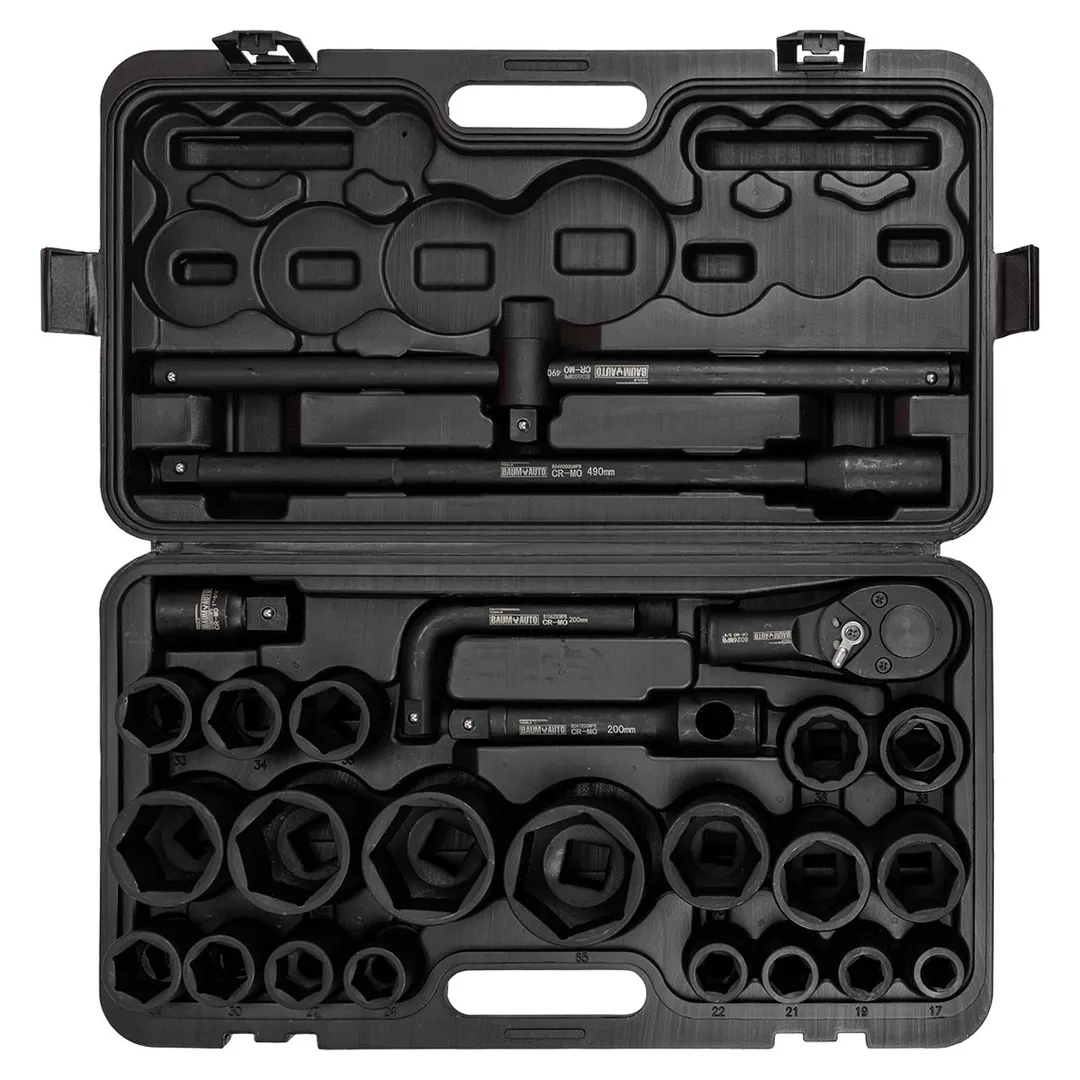 Набор инструментов ударных с посадочным квадратом 3/4" " и 1" . Набор включает в себя ударные головки, трещотку, воротки и удлинители. Они изготовлены из высококачественной хромомолибденовой стали (Cr-MO), что обеспечивает им прочность и долговечность. Головки ударные предназначены для зажима/разжима деталей и другой работы внутри механизмов. Они могут использоваться в автомобильном ремонте, строительстве, промышленных процессах и других областях. Способны выдерживать значительные нагрузки и удары, что позволяет работать с более тугими крепежными элементами и устойчивы к повреждениям. Трещотка и воротки используются вместе с головками для зажима/разжима внутри различных механизмов. Удлинители применяются при работе в труднодоступных местах. Незаменимый инструмент в арсенале любого автомеханика или промышленного работника, который работает с крепежными элементами. Они обеспечивают быстрое и эффективное решение задач, связанных с крепежом. Комплектация: Головки ударные 6-гранные 3/4" : 17-19-21-22-24-27-30-32-33-34-35-36-36(12-гран.)-38-41-46-50 мм; Головки ударные 6-гранные 1" : 55-60-65 мм; Трещотка 3/4" 500мм; Адаптер 3/4" (F)-1" (M); Удлинитель под вороток 490мм; Удлинитель под вороток 200мм; Вороток Г-образный 200мм; Вороток Т-образный 490 мм.Преимущества работы с нами