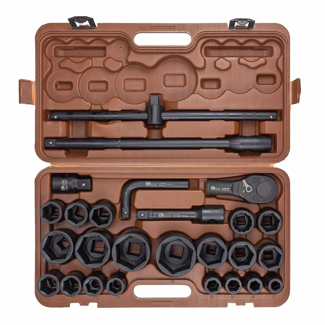 Набор инструментов ударных с посадочным квадратом 3/4" " и 1" . Набор включает в себя ударные головки, трещотку, воротки и удлинители. Они изготовлены из высококачественной хромомолибденовой стали (Cr-MO), что обеспечивает им прочность и долговечность. Головки ударные предназначены для зажима/разжима деталей и другой работы внутри механизмов. Они могут использоваться в автомобильном ремонте, строительстве, промышленных процессах и других областях. Способны выдерживать значительные нагрузки и удары, что позволяет работать с более тугими крепежными элементами и устойчивы к повреждениям. Трещотка и воротки используются вместе с головками для зажима/разжима внутри различных механизмов. Удлинители применяются при работе в труднодоступных местах. Незаменимый инструмент в арсенале любого автомеханика или промышленного работника, который работает с крепежными элементами. Они обеспечивают быстрое и эффективное решение задач, связанных с крепежом. Комплектация: Головки ударные 6-гранные 3/4" : 17-19-21-22-24-27-30-32-33-34-35-36-36(12-гран.)-38-41-46-50 мм; Головки ударные 6-гранные 1" : 55-60-65 мм; Трещотка 3/4" 500мм; Адаптер 3/4" (F)-1" (M); Удлинитель под вороток 490мм; Удлинитель под вороток 200мм; Вороток Г-образный 200мм; Вороток Т-образный 490 мм.Преимущества работы с нами