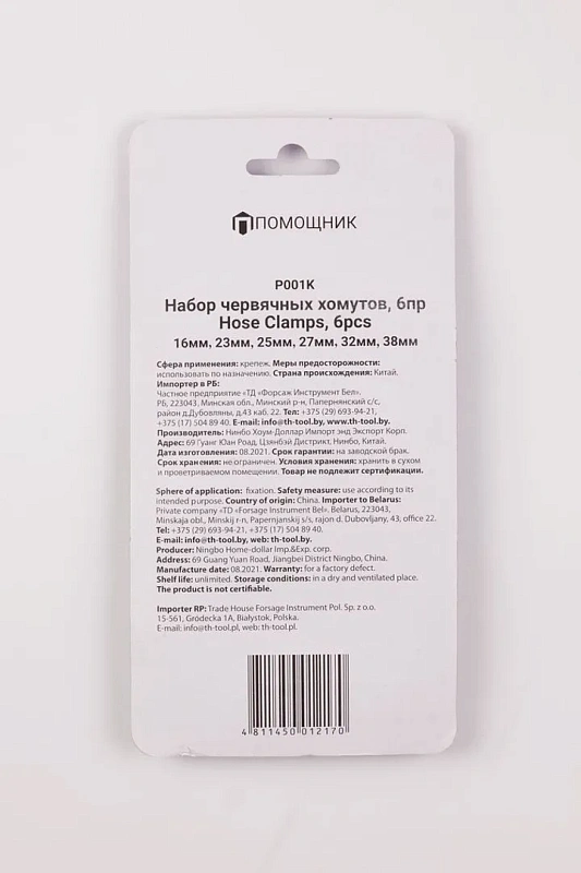 Набор хомутов червячных 6 пр. Помощник P001K, описание и характеристики: