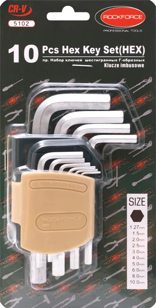 Набор ключей HEX (6-гр) Г-образных, 10 пр., 1.27-10 мм RockForce RF-5102, описание и характеристики: