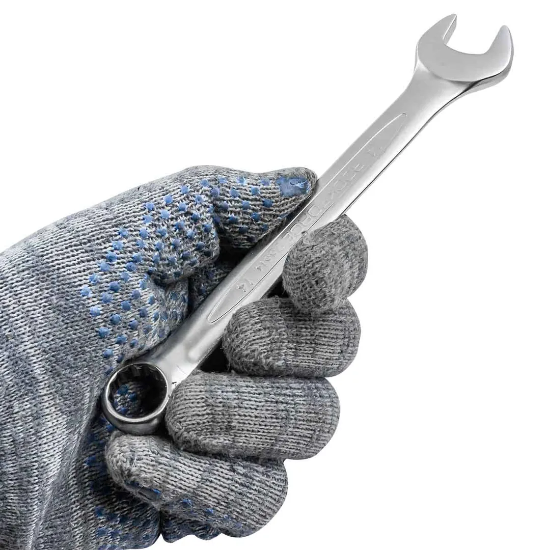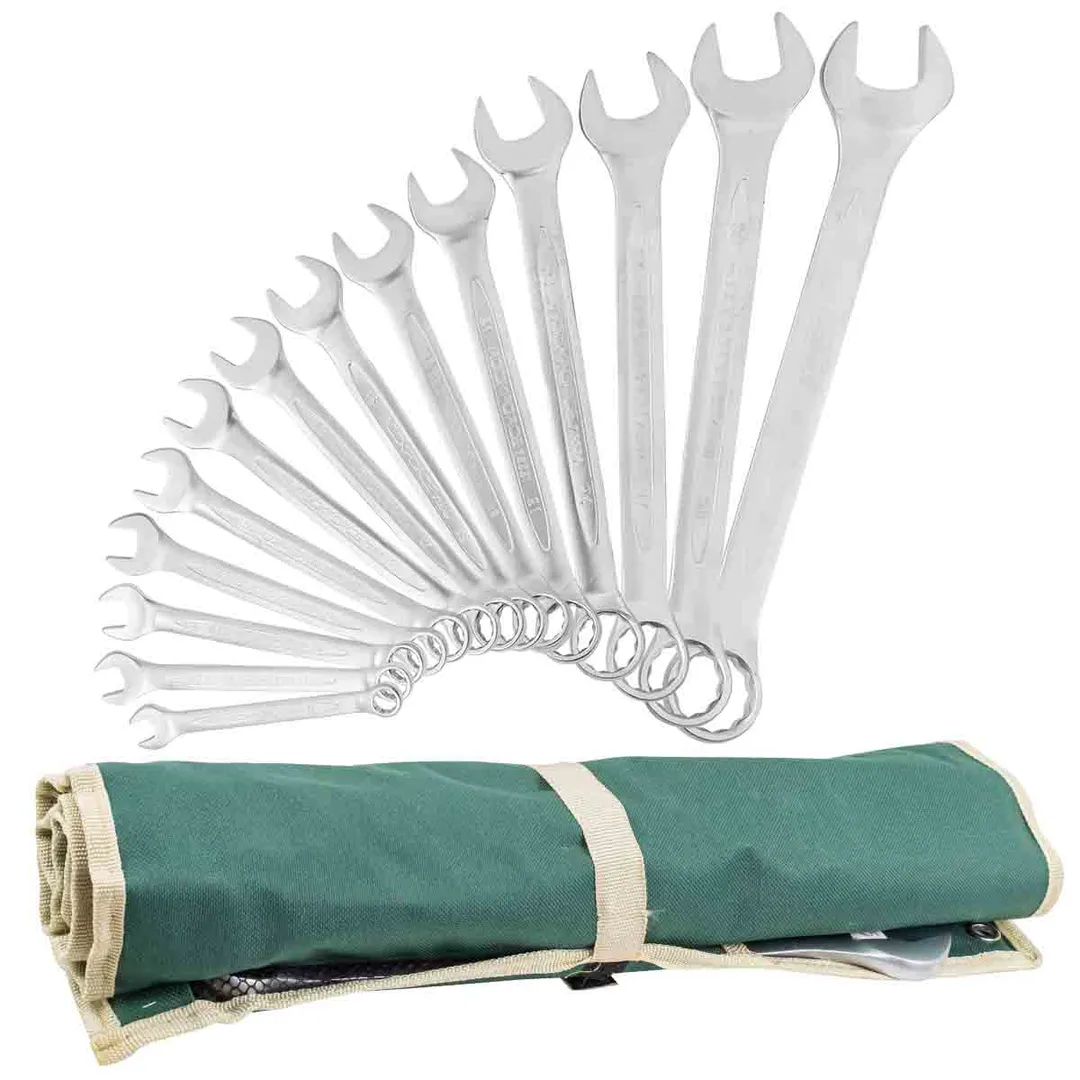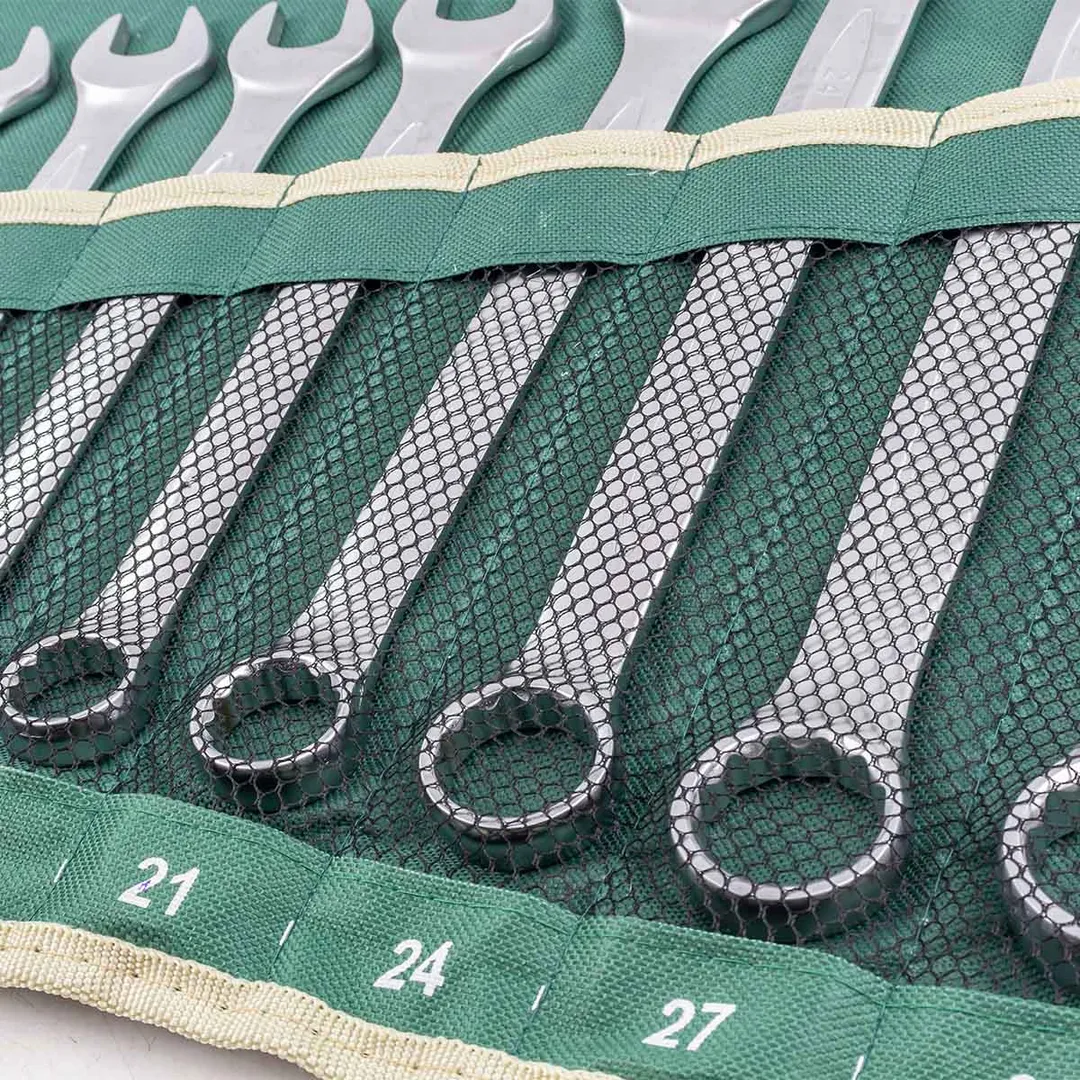 Ключи комбинированные – универсальные гаечные ключи, совмещающие в себе функционал и преимущества рожковых и накидных ключей. Зевы комбинированных ключей имеют одинаковые размеры. Ключи гаечные с открытым и кольцевым зевами предназначены для монтажа либо демонтажа резьбовых соединений. Набор изготовлен из высококачественной стали Cr-V. Ключи фиксируются на полотне, которое имеет специальные отверстия в верхних углах полотна, для фиксации его на стене. Комплектация: 10, 12, 13, 14, 15, 16, 17, 18, 19, 21, 24, 27, 30, 32 мм.Преимущества работы с нами