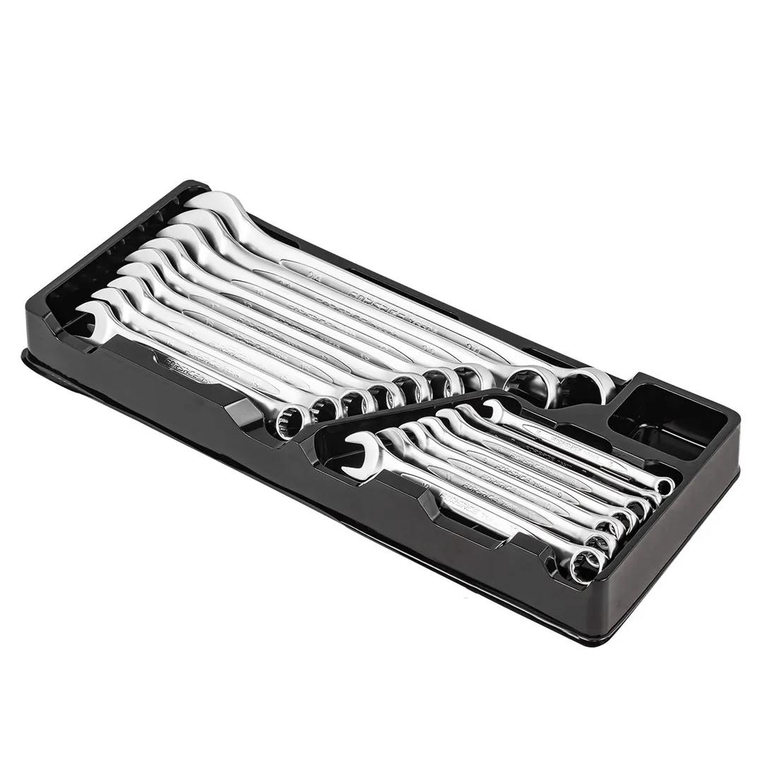 Ключи комбинированные – универсальные гаечные ключи, совмещающие в себе функционал и преимущества рожковых и накидных ключей. Зевы комбинированных ключей имеют одинаковые размеры. Ключи гаечные с открытым и кольцевым зевами предназначены для монтажа либо демонтажа резьбовых соединений. Набор изготовлен из высококачественной стали Cr-V. Ключи поставляеются в удобном пластиковом лотке. Комплектация: 6, 7, 8, 9, 10, 11, 12, 13, 14, 15, 16, 17, 18, 19, 22, 24 мм.Преимущества работы с нами