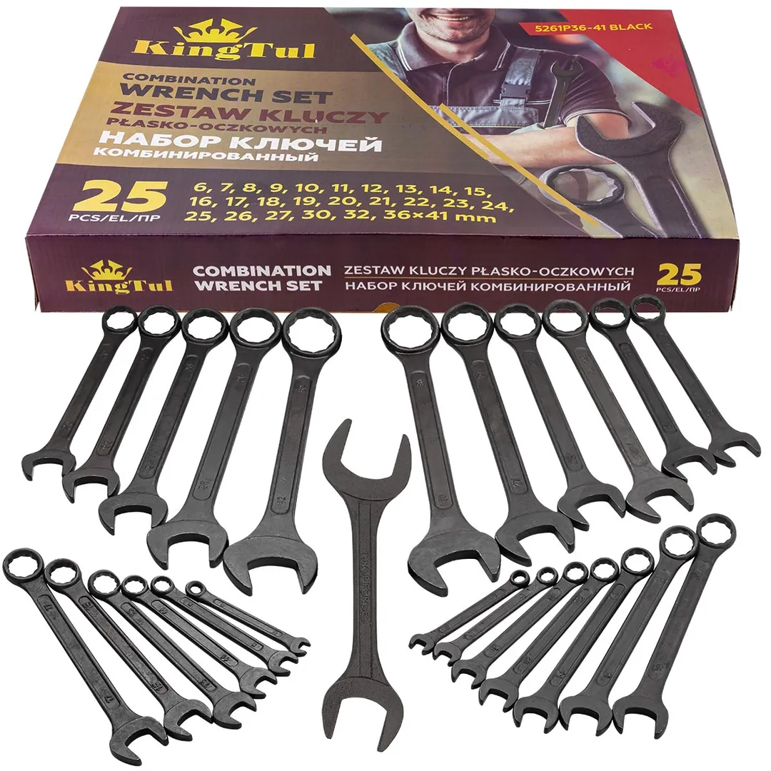 Набор ключей комбинированных 25 пр, 6-27, 30, 32, рожковый ключ 36х41 мм KINGTUL KT-5261P36-41 Black