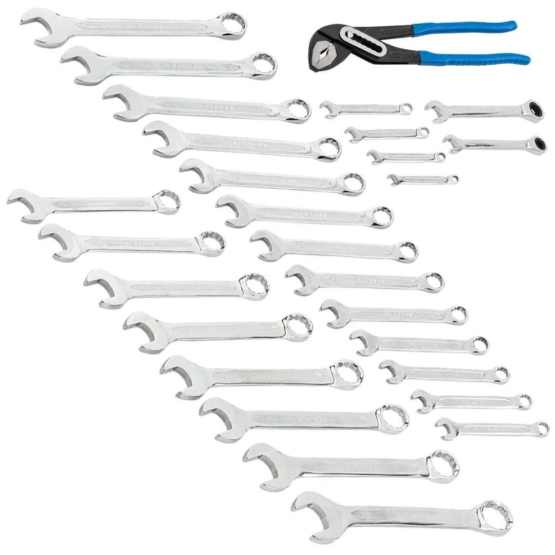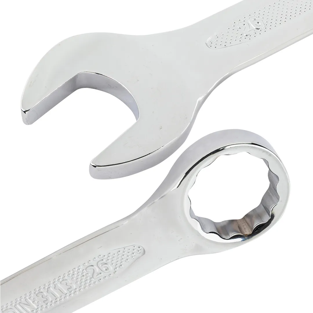 Набор ключей комбинированный включает в себя комбинированные ключи и ключи комбинированные трещоточные. Ключи изготовлены из хромованадиевой стали. Ключи комбинированные – универсальные гаечные ключи, совмещающие в себе функционал и преимущества рожковых и накидных ключей. Зевы комбинированных ключей имеют одинаковые размеры. Ключи гаечные с открытым и кольцевым зевами предназначены для монтажа либо демонтажа резьбовых соединений. Трещоточный механизм в накидной части ключа позволяет комфортно работать в местах с ограниченным пространством В комплект входит специальное полотно-чехол с кармашками под каждый ключ для удобства хранения и перемещения набора ключей. Кроме того, чехол снабжён люверсовыми подвесами для закрепления на стене. Комплектация: Ключи комбинированные 25 пр: 6, 7, 8, 9, 10, 11, 12, 13, 14, 15, 16, 17, 18, 19, 20, 21, 22, 23, 24, 25, 26, 27, 28 мм; Ключи трещоточные 2 пр: 10, 13 мм.Преимущества работы с нами