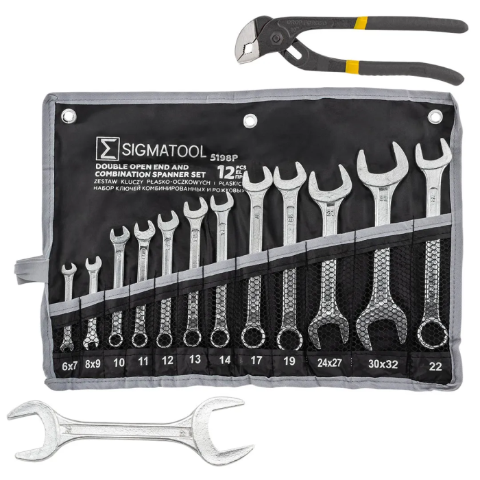 Набор комбинированных 10-22 мм и рожковых ключей 6х7, 8х9, 24х27, 30х32, 36х41 мм, пассатижи, 14 пр SIGMATOOL Sigmatool-5198P+2