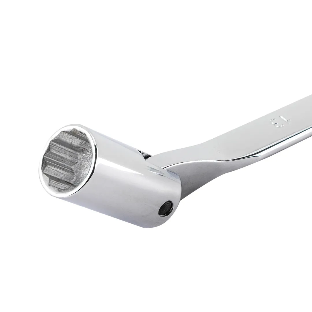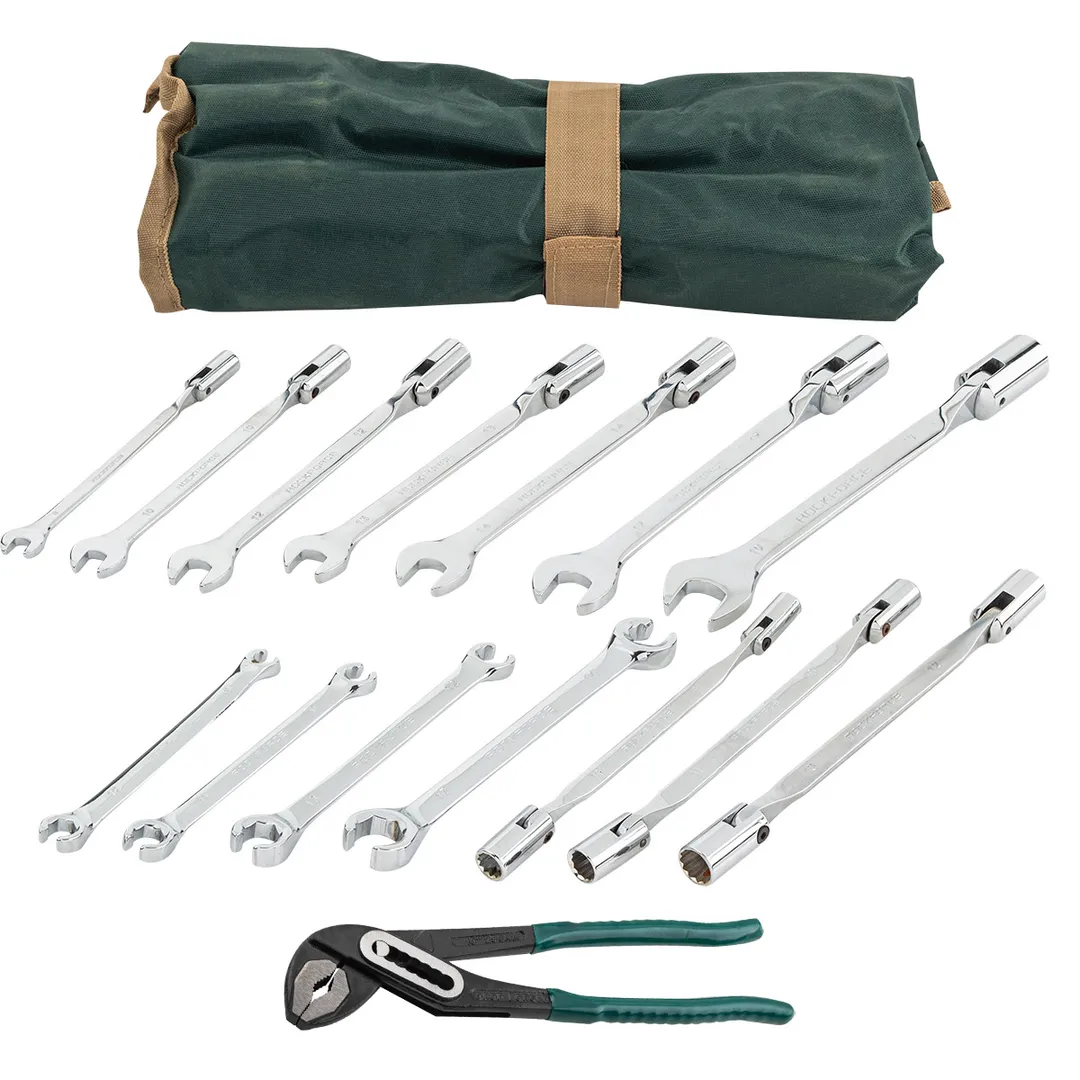 Набор ключей комбинированный включает в себя рожково-торцевые ключи, ключи торцевые шарнирные и ключи разрезные. Ключи изготовлены из хромованадиевой стали. Ключи рожково-торцевой шарнирный - это универсальный и многофункциональный инструмент для работы с различными типами крепежа. Предназначены для работы с резьбовыми и торцевыми соединениями. Состоят из рожкового ключа и 12-ти гранной торцевой головки. Поворот торцевой головки параллельно телу ключа позволяет быстро отворачивать и заворачивать крепёж, когда не требуется приложение большого усилия. Рожковый профиль позволяет работать с крепежом в случаях, когда доступ к крепежу возможен лишь с одной стороны. Шарнирное соединение позволяет изменять угол наклона торцевой части и упрощает работу в труднодоступных местах. Ключи разрезные предназначены для работы в автосервисах, на станциях технического обслуживания автомобилей. С их помощью производится ремонт тормозных систем, подачи топлива, смазки, кондиционирования в труднодоступных местах. В комплект входит специальное полотно-чехол с кармашками под каждый ключ для удобства хранения и перемещения набора ключей. Кроме того, чехол снабжён люверсовыми подвесами для закрепления на стене. Комлпектация: Ключи разрезные: 8х10, 9х11,12х13, 14х17 мм; Ключи торцевые шарнирные: 8х10,10х11,12х13мм; Ключи рожково-торцевые: 8,10,12,13,14,17,19 ммПреимущества работы с нами