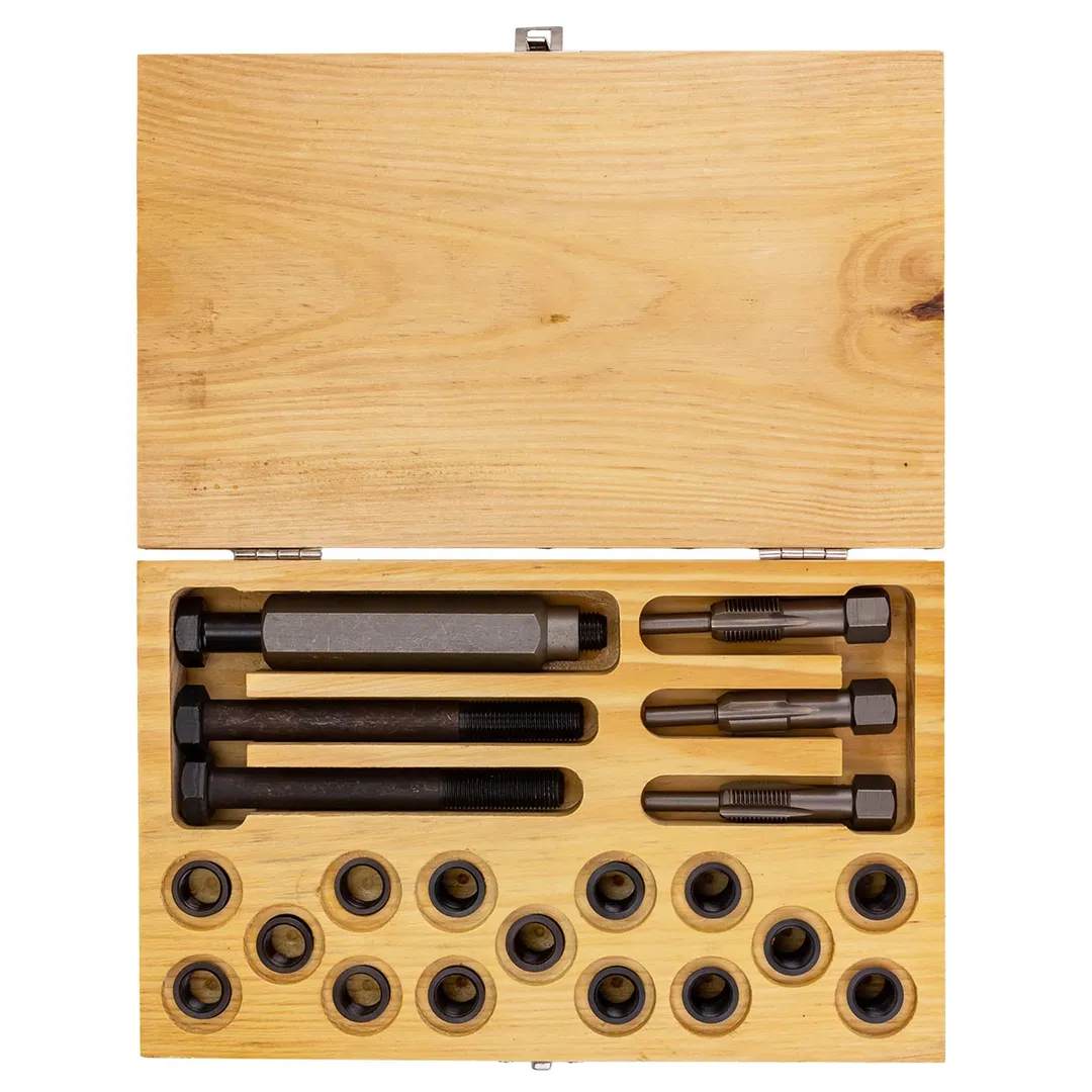 Набор метчиков и футорок для восстановления резьбы свечей накаливания 21 предмета представляет собой комплект инструментов, который используется для восстановления поврежденной резьбы в металлических поверхностях. Он содержит футорки и метчики различных размеров, которые позволяют восстановить резьбу в отверстиях разного диаметра. Этот набор инструментов может быть использован профессиональными мастерами и любителями ремонта. Он помогает восстановить поврежденную резьбу в металлических поверхностях, что является необходимым для многих видов работ. Упакован в деревянный кейс для удобства хранения и эксплуатации. Размеры: (M12x1.25-15шт).Преимущества работы с нами